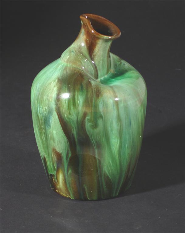 A Linthorpe Pottery ewer designed by Dr Christopher Dresser, simple pinched form with angled spout, covered in a running green glaze impressed factory mark 14.5cm. high