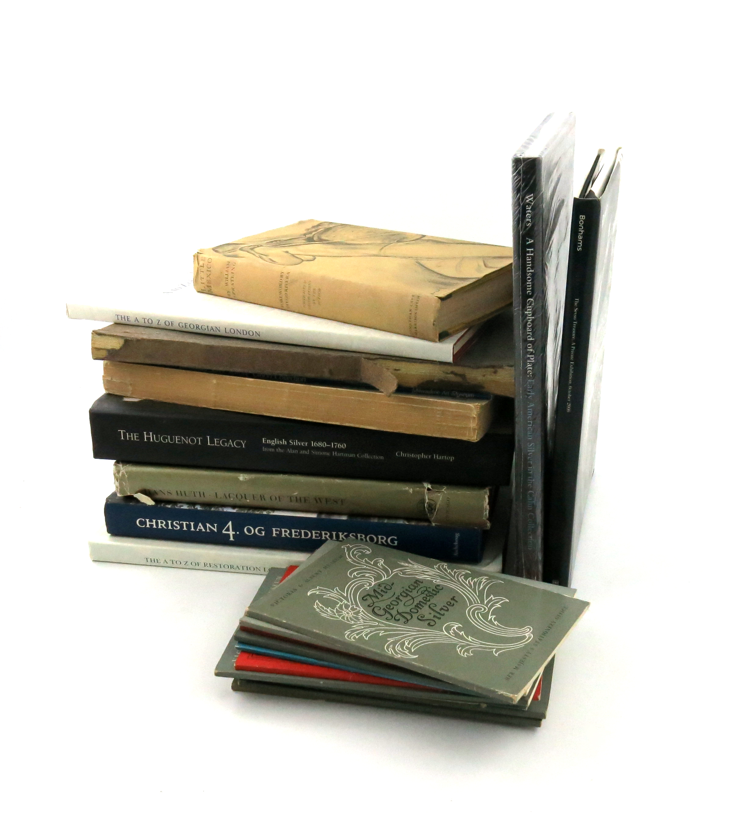 including: The Huguenot Legacy, Silver Art Sales, Early American silver in the Cahn Collection, the Sevso Treasure, plus other volumes and non-silver related volumes, including the A-Z of Restoration London, the A-Z of Georgian London, and other volumes. (qty) (four boxes).