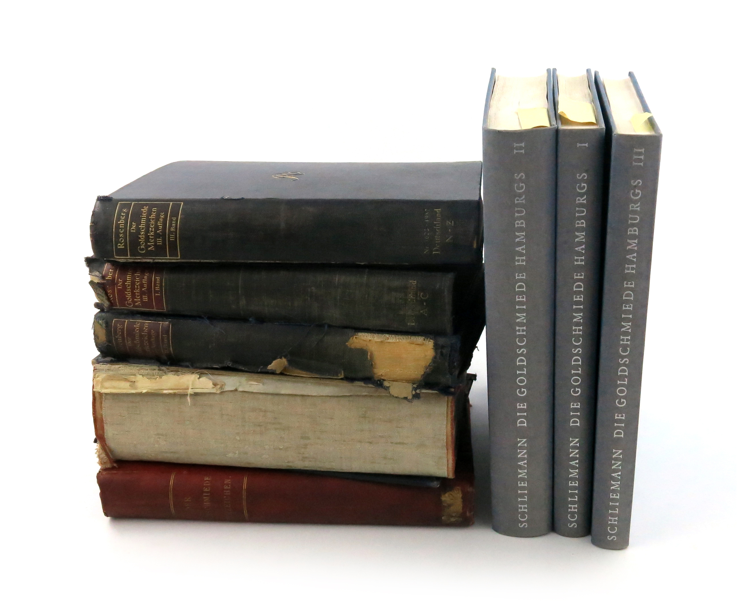 Rosenberg, M., Der Goldschmiede Merkzeichen,1925, in four volumes, hard bound, (a/f), plus one 1890 copy, and Schliemann, E. Die Goldschmiede Hamburgs, 1985, Volume I-III. (8)