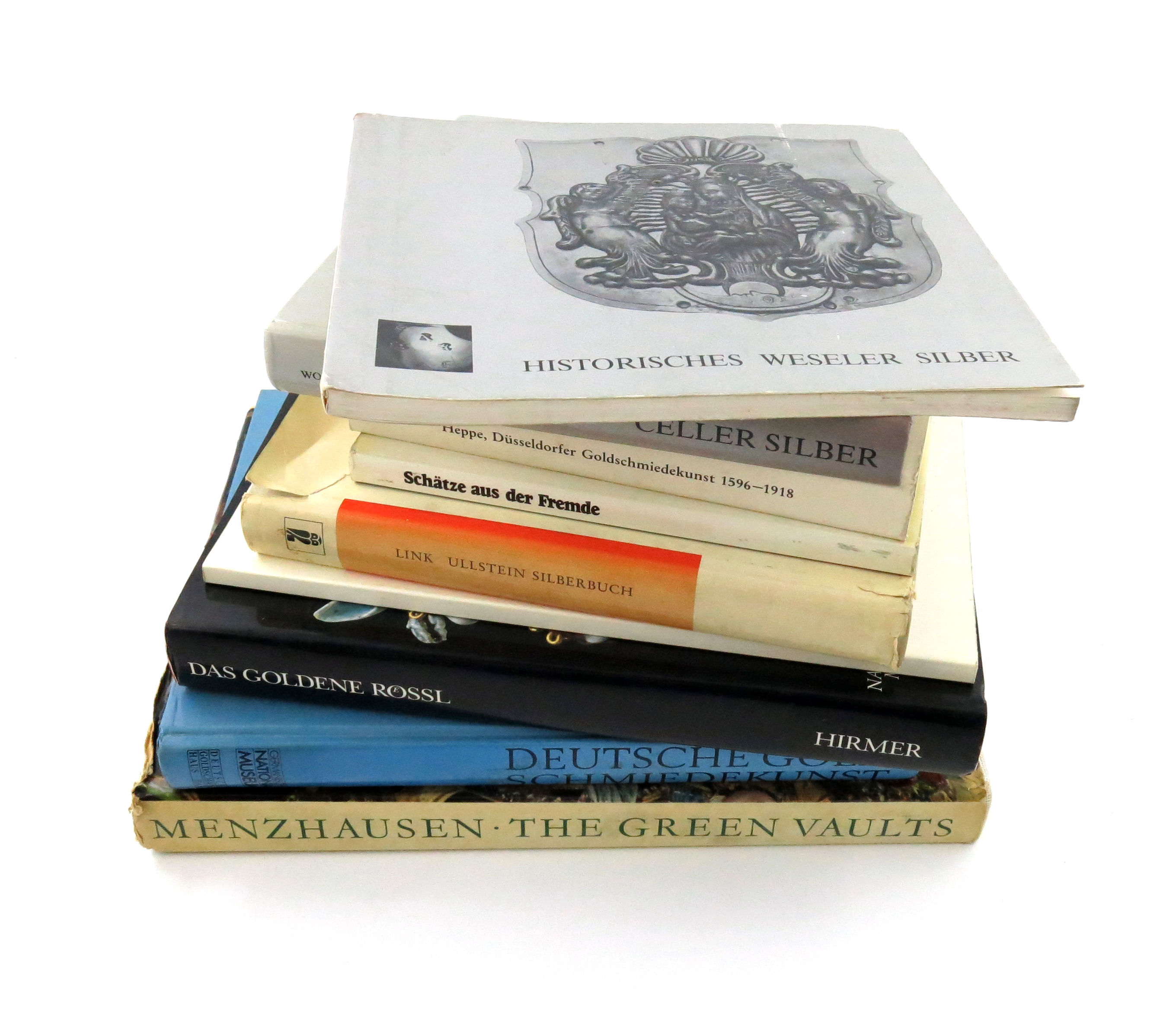 including: Scheffler, W., Celler Silber, Dusseldorfer Goldschmiedekunst 1596-1918, Schatze aus der Fremde, Deutsche Gold-Schmiedekunst, Ullstein Silberbuch, Kasseller Silber, Barockes Silber Aus Rheinischen Sammlungen, Silber Auf Reisen and other volumes. (qty) (Two Boxes).