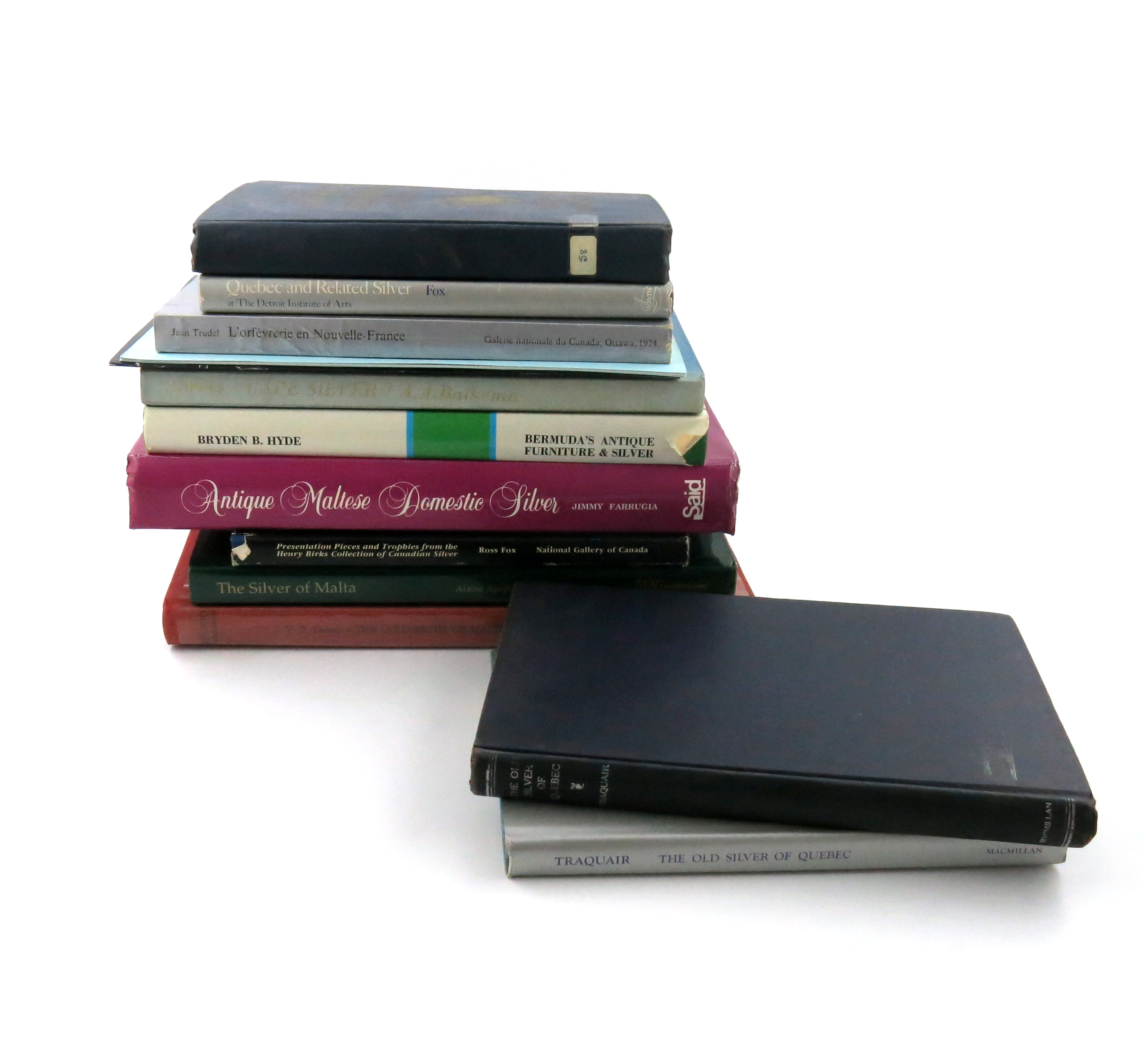 including: Denaro, V., The Goldsmiths of Malta and Their Marks, Alaine Apapa Bologna, The Silver of Malta, Farrugia, J., Antique Maltese Domestic Silver, Bermuda's Antiques Furniture and Silver, Cape Silver, Presentation Pieces and Trophies from the Henry Birks Collection of Canadian Silver, L'Orfevrerie en Nouvelle-France, Quebec and Related Silver, Master Goldsmiths and Silversmiths of Nova Scotia, The Old Silver of Quebec, and another volume. (qty)