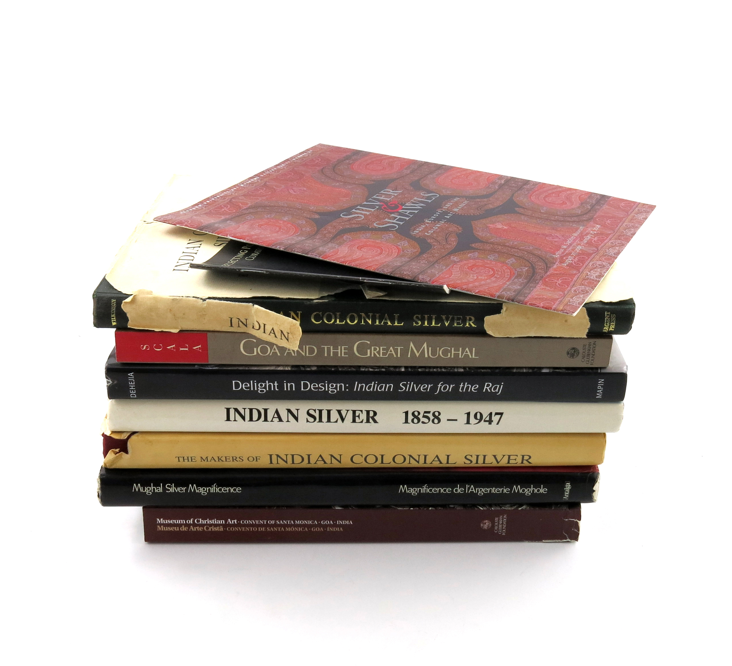 comprising: Wilkinson, W., The Makers of Indian Colonial Silver, 1973 and 1987 editions, Indian Silver 1858-1947, by the same author, Delight in Design, Indian Silver for the Raj, Mughal silver Magnificence, Museum of Christian Art, Convent of Santa Monica, Goa, India, plus Goa and the Great Mughal, and two pamphlets. (9)