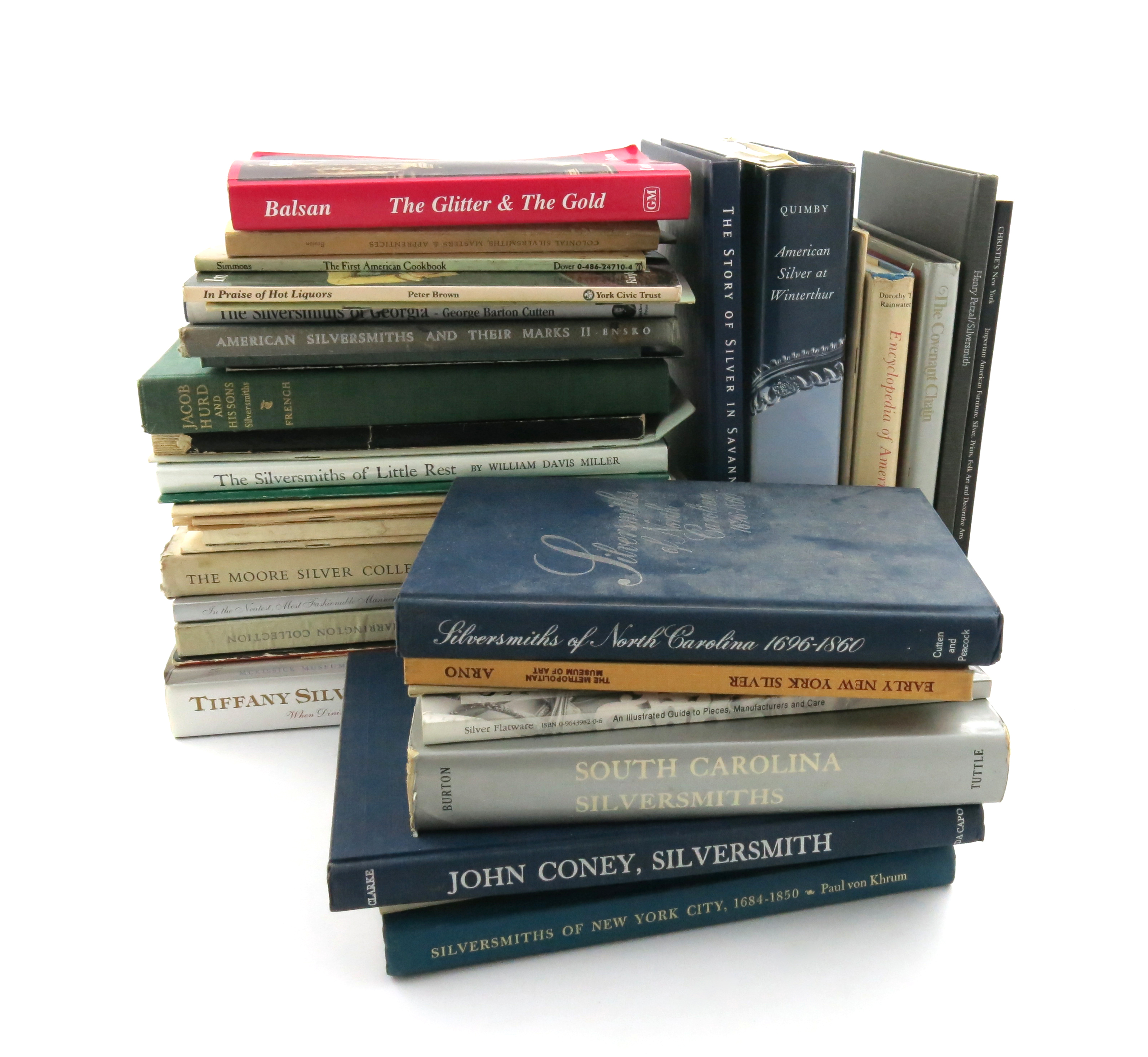including: Silver in Maryland, Silver in the Golden State, Early American Silver, Myer Myers, Massachusetts Silver in the Harrington Collection, Tiffany Silver Flatware, Jacob Hurd and his Sons, American Silver at Winterthur, Silversmiths of North Carolina, South Carolina Silversmiths and other volumes. (qty) (two boxes).