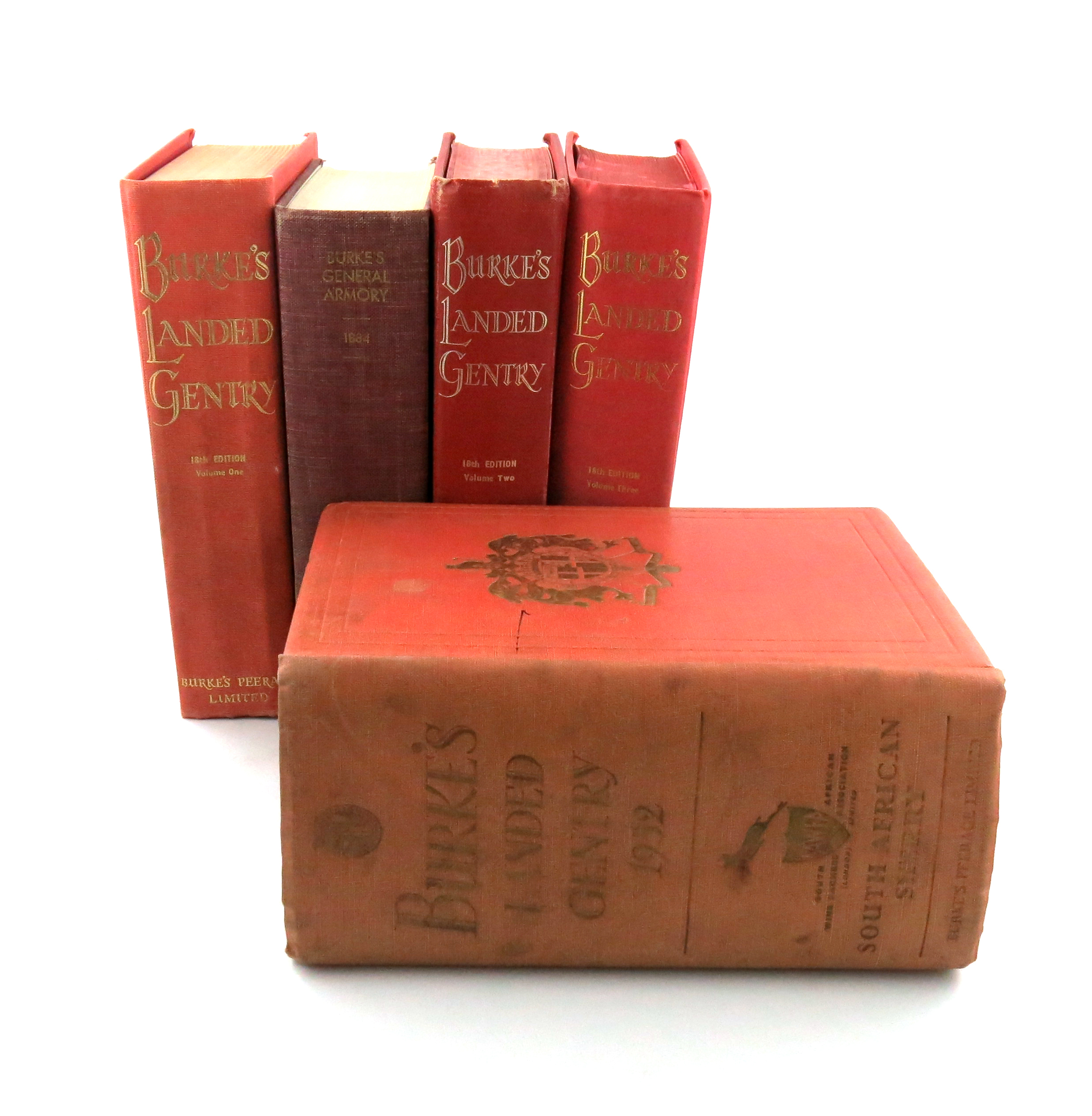 Burke's Peerage and Baronetage, 71st edition, 1909, 106th edition, 1999, two volumes, Burke's Peerage, Baronetage and Knightage, 107th edition, 2003, three volumes, Burke's Landed Gentry, centenary Edition, 1937, plus 17th edition, 1952, 18th edition 1965-9, Three volumes, 19th edition, 2005, two volumes, plus Burke's General Armory, 1884, Burke's Extinct and Dormant Baronetcies and Burkes Family Index. (16)