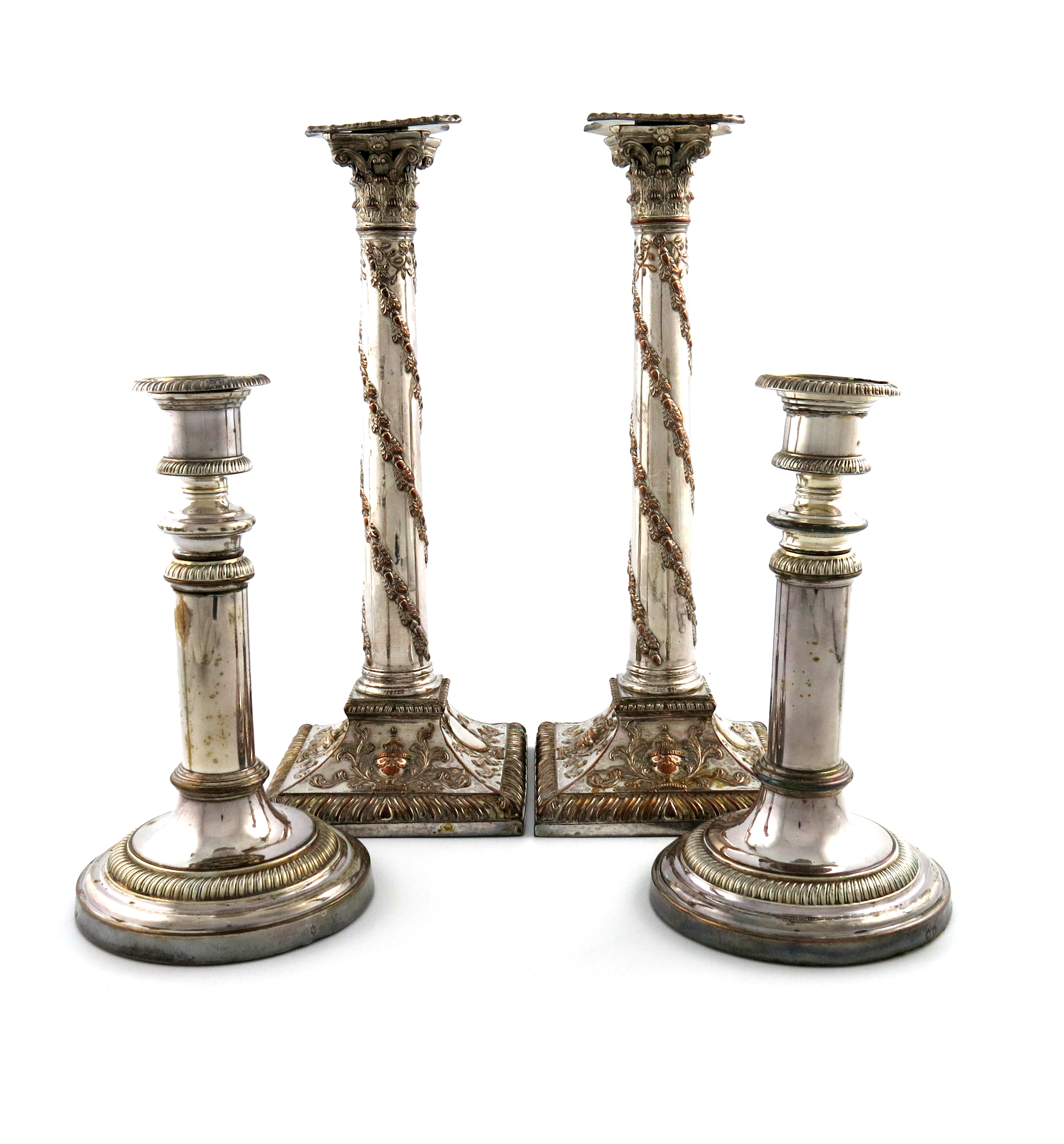 Corinthian column form, detachable drip pans with a gadroon border, the columns with swirl acorn and oak leaf decoration, on raised square bases with urns and foliate decoration, gadroon borders, height 32.5cm, plus a pair of George III telescopic candlesticks, by Matthew Boulton, circa 1810, on raised circular bases with a gadroon border. (4)