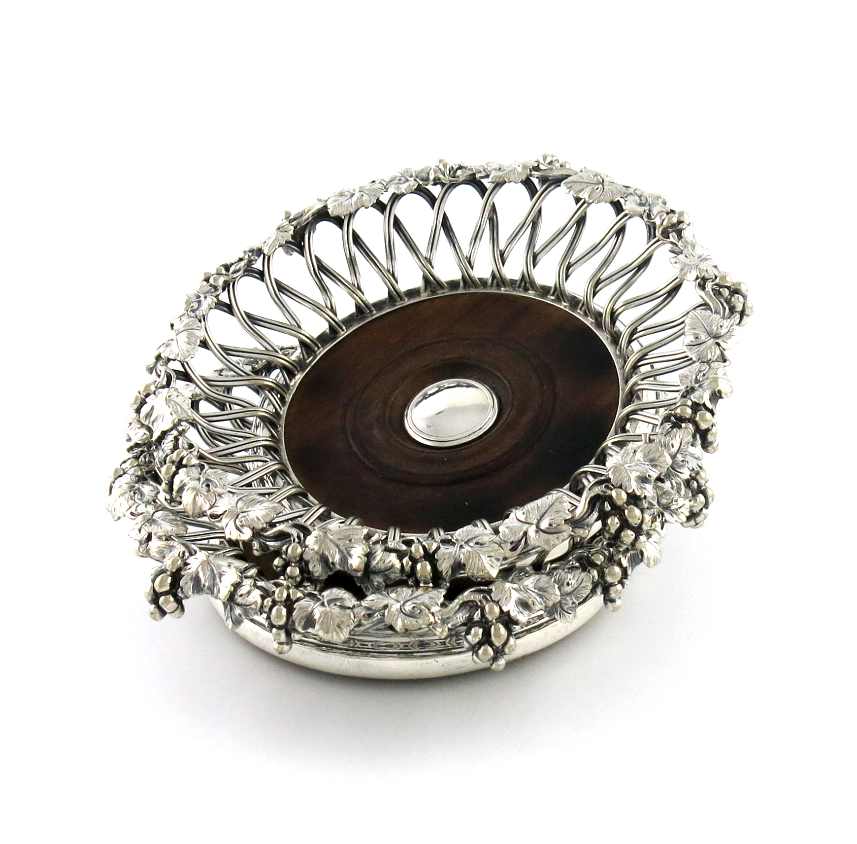 circular form, wire-work bodies, trailing grapevine borders, turned wooden bases set with central buttons, diameter 19cm. (2)