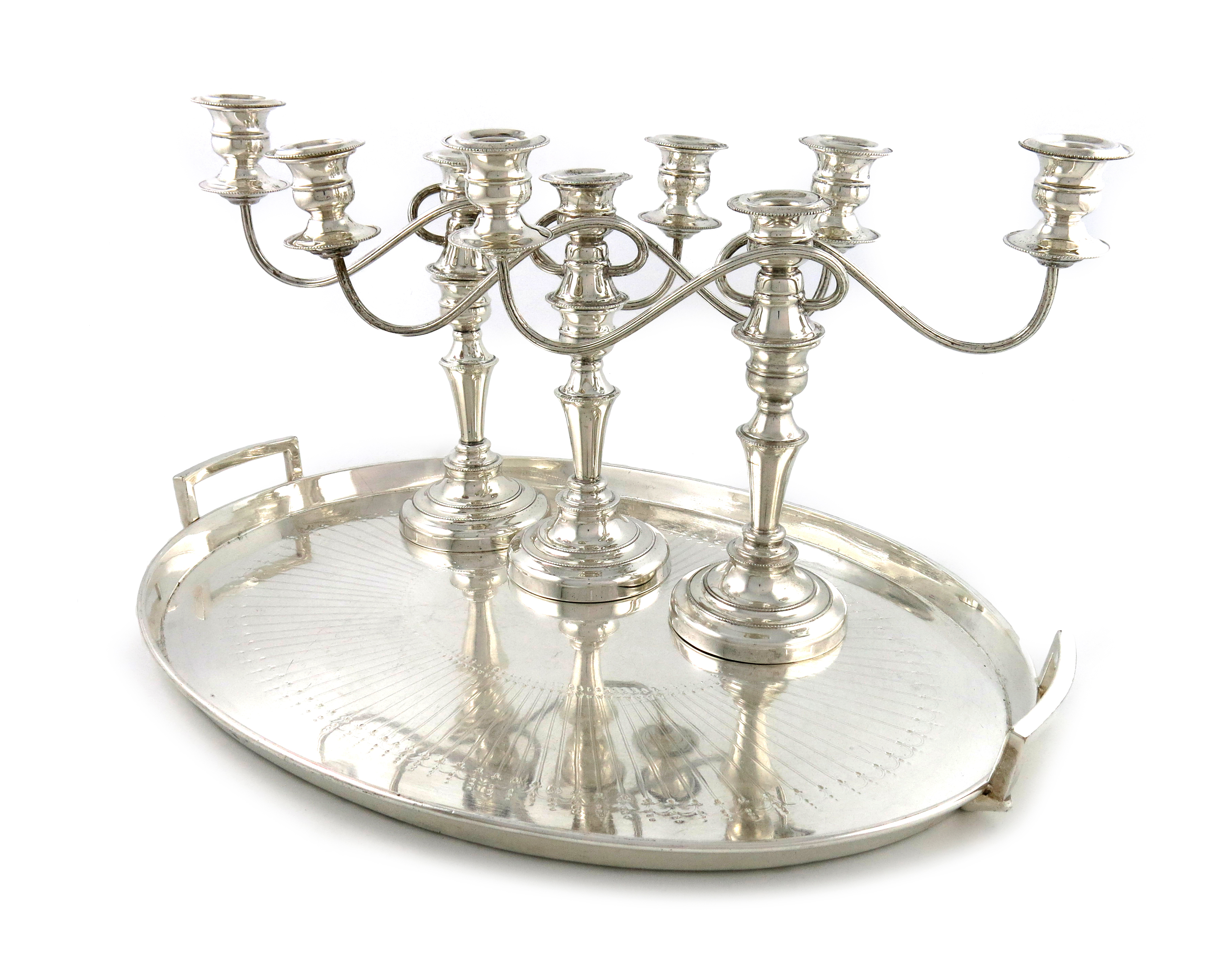 oval form, radiating decoration, length 59cm, plus three electroplated three-light candelabra, height 28cm. (4)
