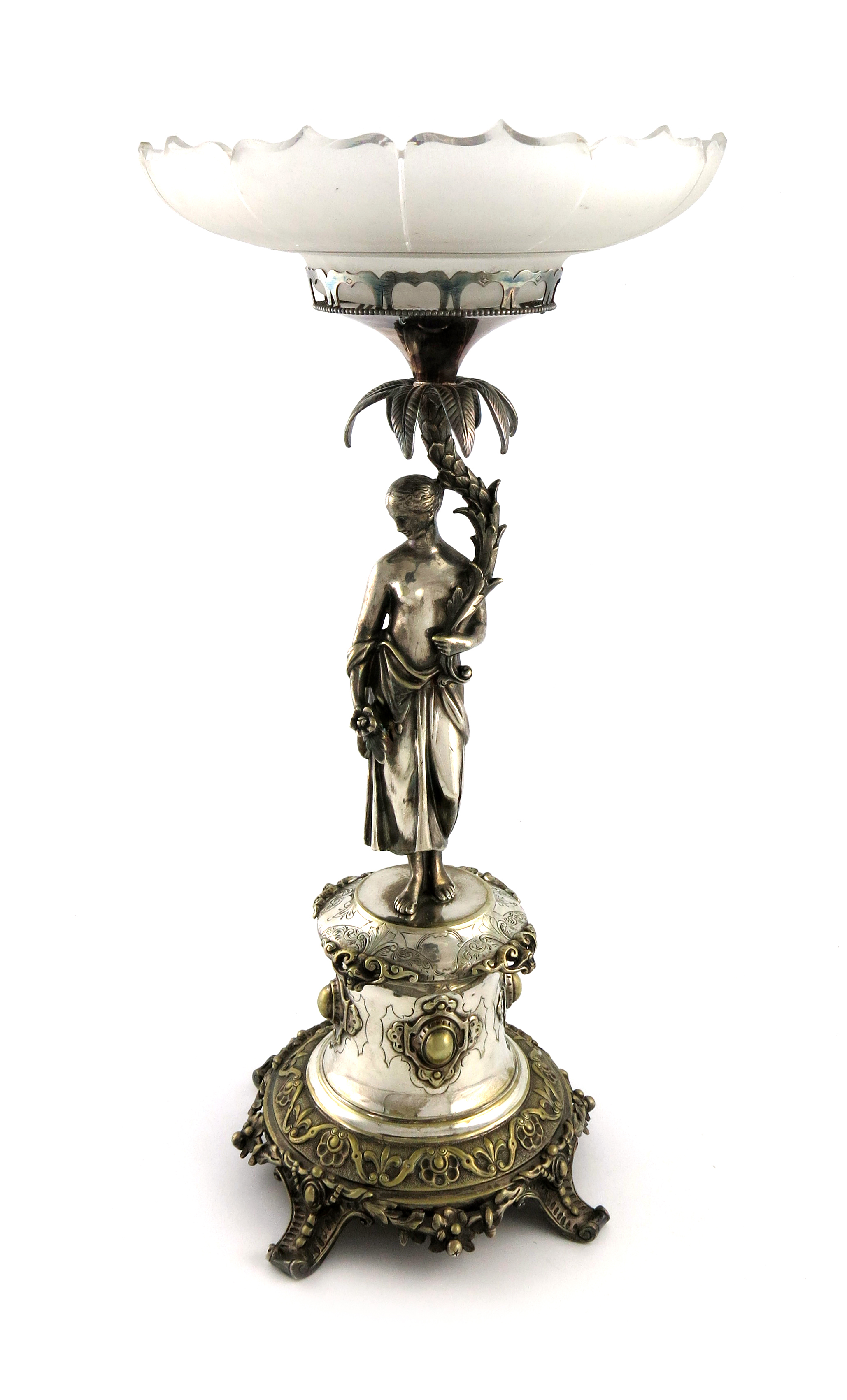 the central column modelled as a maiden holding a palm tree, with a pierced circular gallery and with a cut glass bowl, on a raised circular base with stylised decoration, on four scroll bracket feet, height 53.4cm.