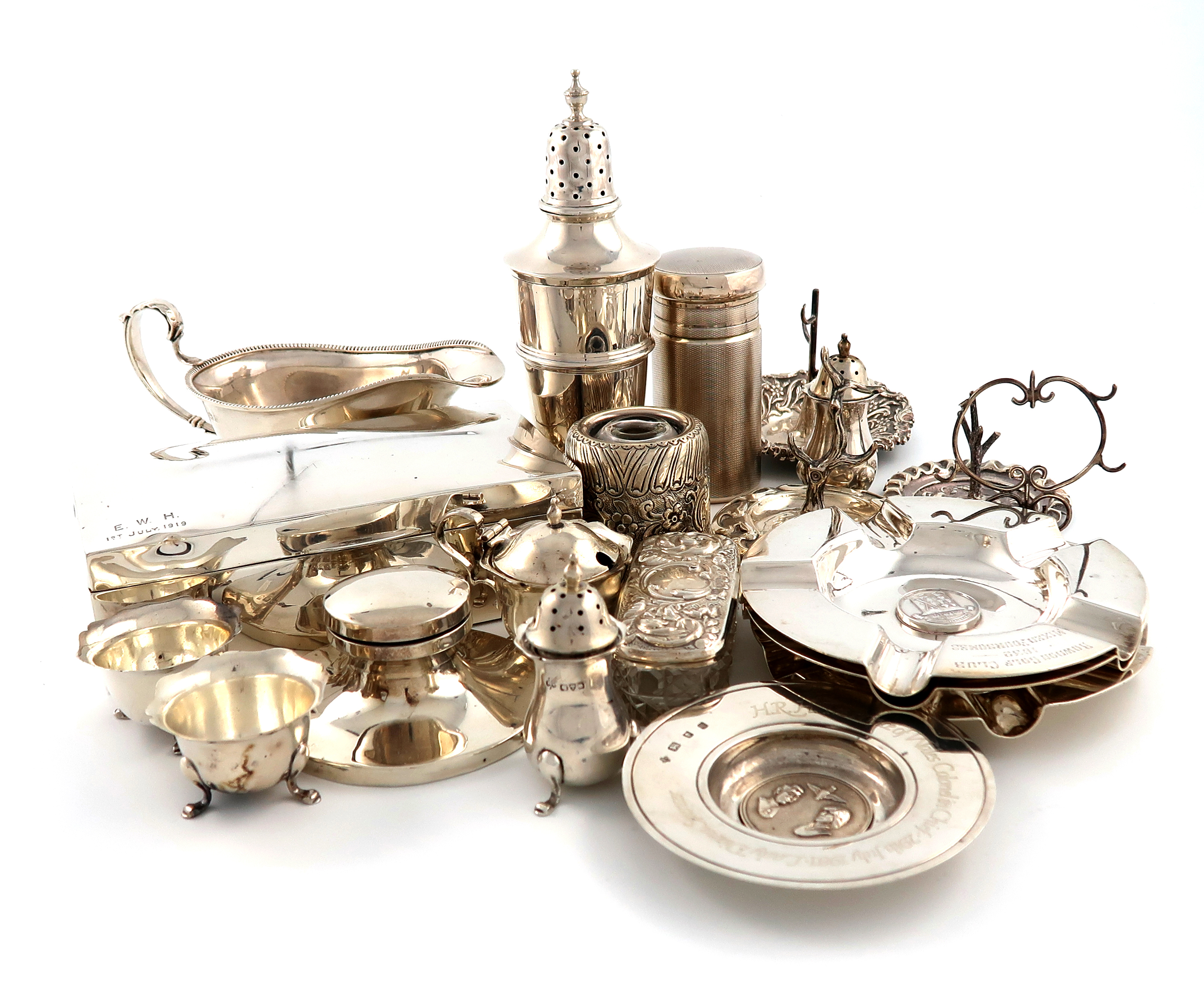 comprising: four ring trees, an engine-turned travelling toilet jar, a sugar caster, two inkwells, a sauce boat, a cigarette box, a toilet box, a five-piece condiment set, and four ashtrays, approx. weighable 39oz. (qty)