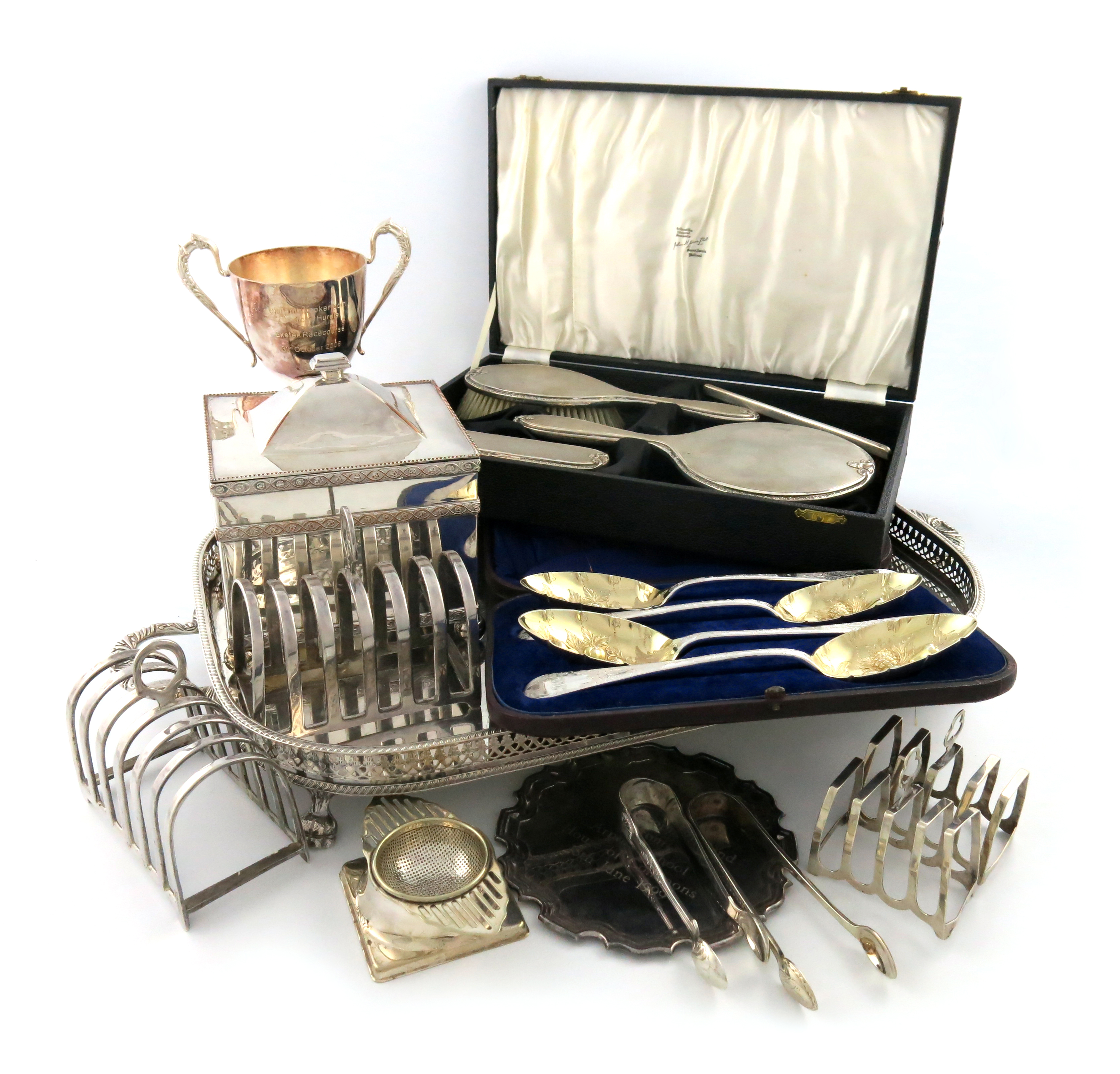 comprising silver items: a cased set of six Old English pattern dessert spoons, Sheffield 1941, a cased four-piece dressing table set, a set of twelve coffee spoons, retailed by Harrods, a set of six teaspoons, a pair of toast racks, two pairs of sugar tongs, a small waiter, plus electroplated items: a gallery tray, a caddy, a cased set of four berry spoons, a trophy cup, an entree dish and cover, a pair of toast racks, a single toast rack, a sauce boat, plus a set of twelve mother-of-pearl handled fruit knives and forks, various cased sets of flatware, and a set of six bone-handled steel knives and forks, approx. weighable 25oz. (qty)