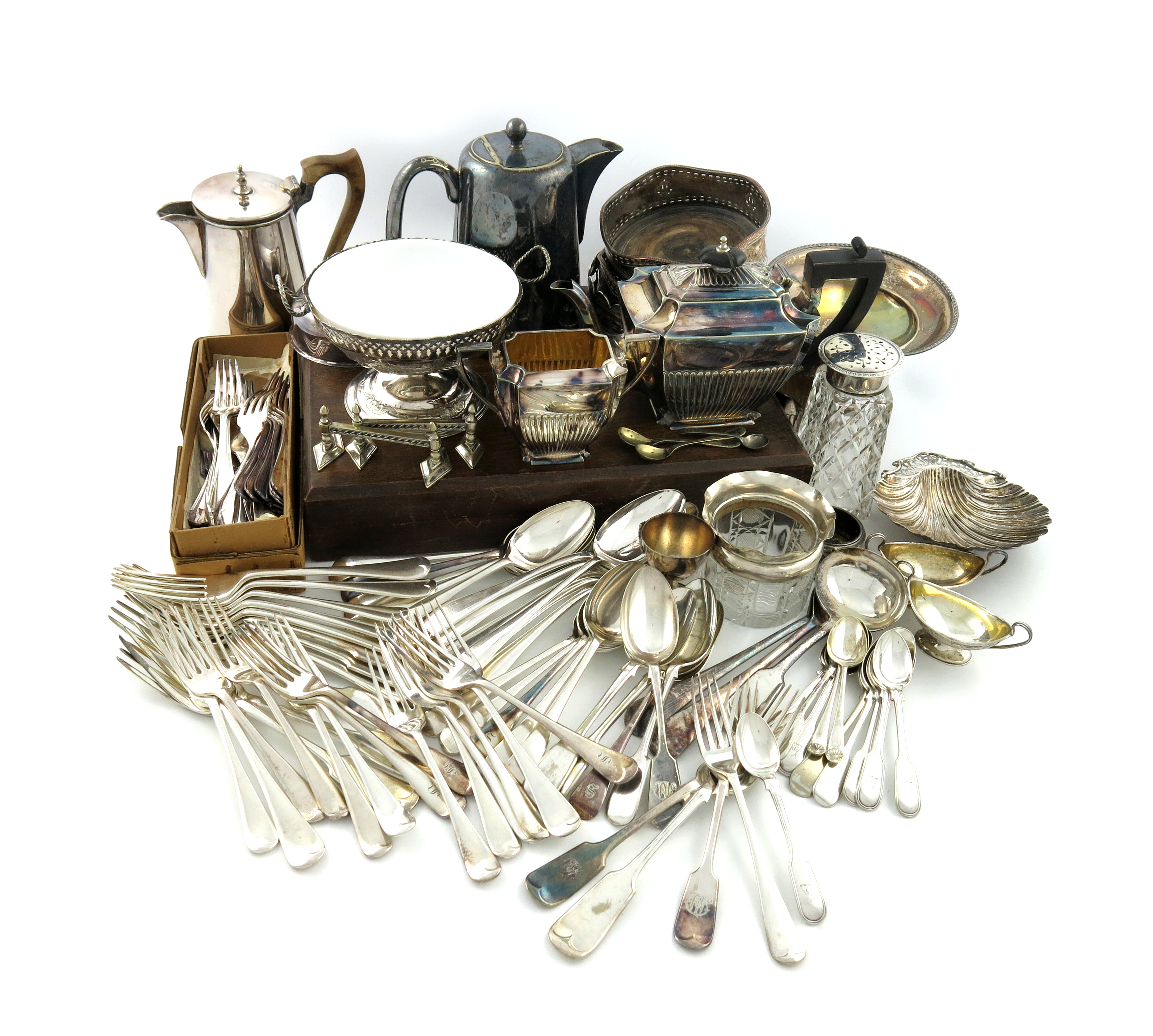 comprising silver items: a tazza, by Mappin and Webb, London 1909, a pair of Victorian salt cellars, a shell butter dish, a silver-mounted glass sugar caster, a salt cellar, a silver-mounted glass jar, plus a pair of old Sheffield plated wine coasters, a single Old Sheffield plated wine coaster, plus electroplated items: a three-piece tea set , a hot water pot, a two-handled bowl with a white liner, a set of twelve fish eaters, with ivorine handles, cased and other flatware, approx. weighable 10oz. (qty)