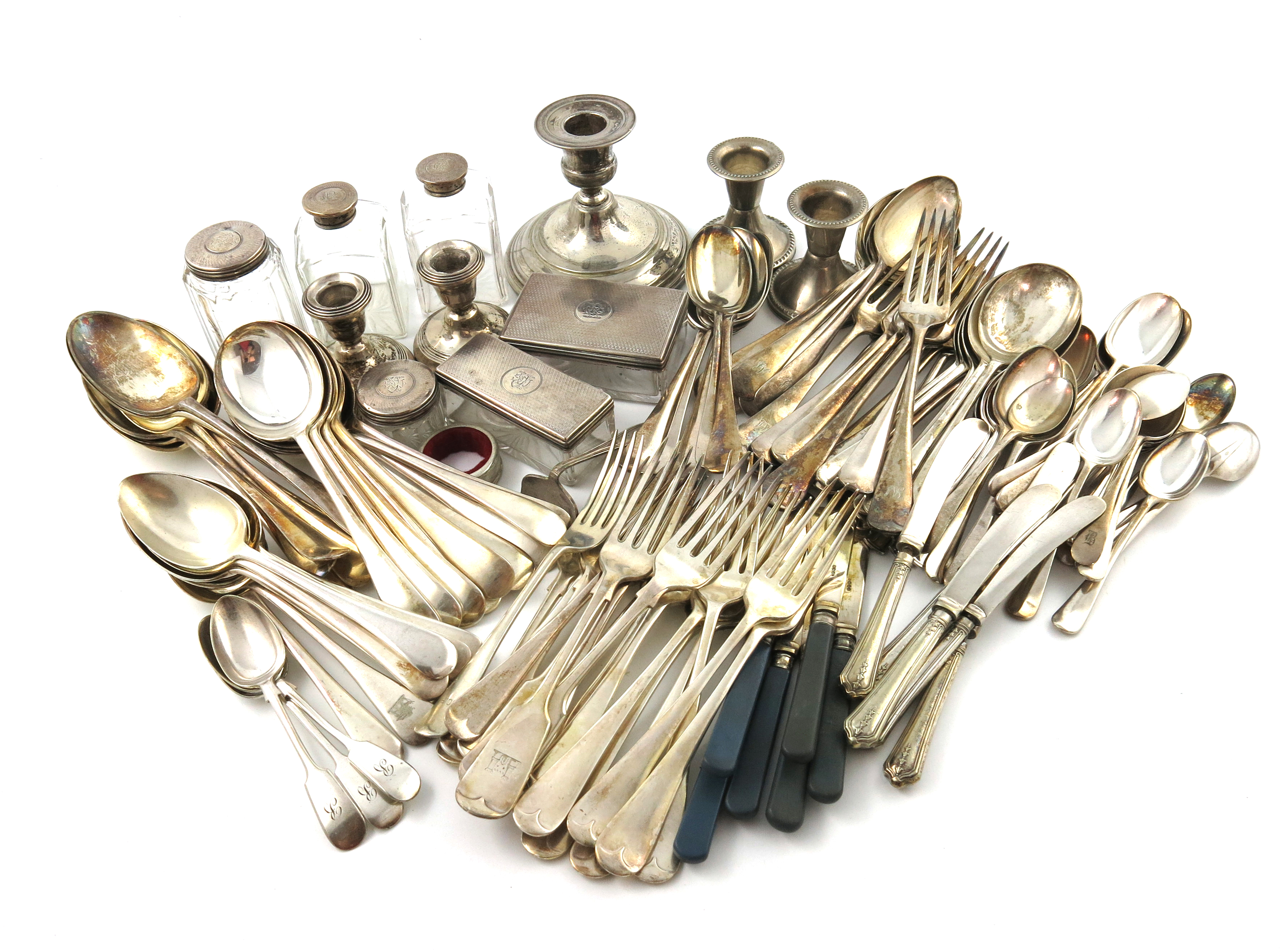 comprising: a pair of dwarf candlesticks, Birmingham 1958, six silver-mounted toilet jars and boxes, plus electroplated items: a pair of dwarf candlesticks, a single candlestick and a quantity of electroplated flatware, approx. weighable 2.5oz. (qty)