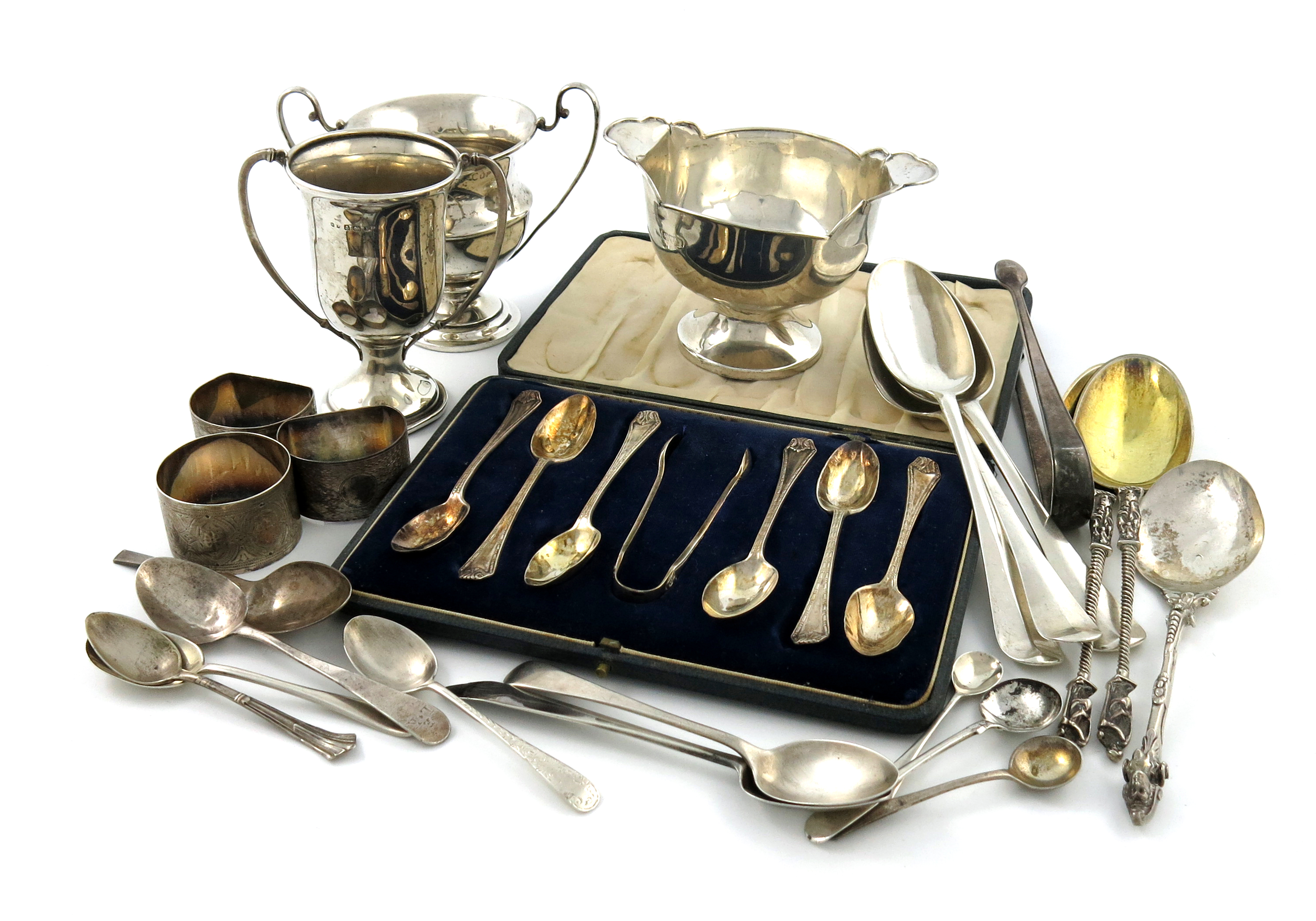 comprising: a George III picture-back tablespoon, London 1767, the reverse of the bowl with a dove with an olive branch in its beak, plus two further tablespoons, a continental spoon, a pair of Victorian spoons with Apostle finials, London 1865, a pair of sugar tongs, a cased set of six teaspoons and tongs, nine various spoons, three trophy cups and three napkin rings, approx. weighable 26oz. (qty)