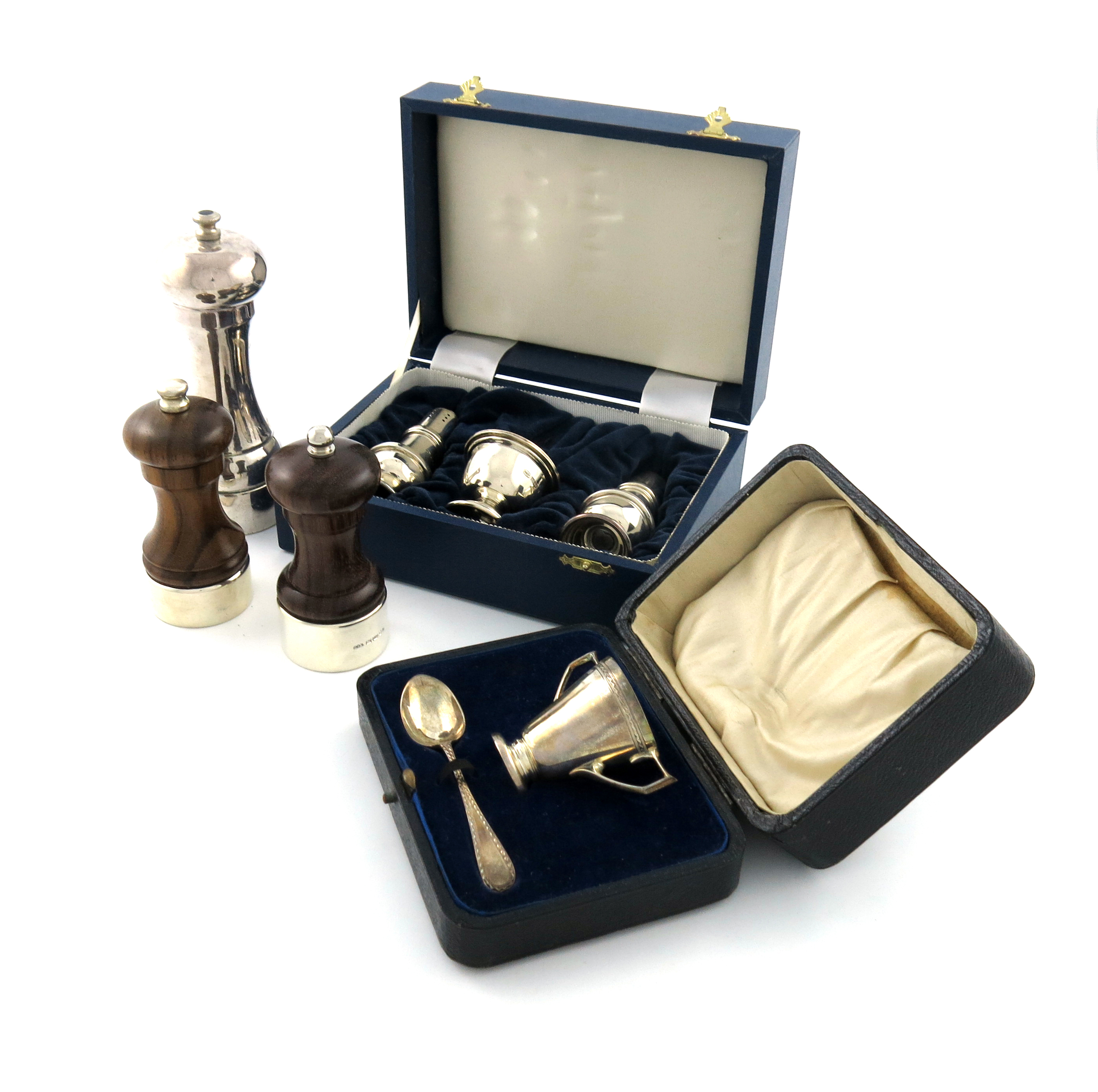comprising: a cased three-piece condiment set, two silver-mounted wooden pepper mills, a cased egg cup and spoon, and an electroplated pepper mill, approx. weighable 7oz. (5)