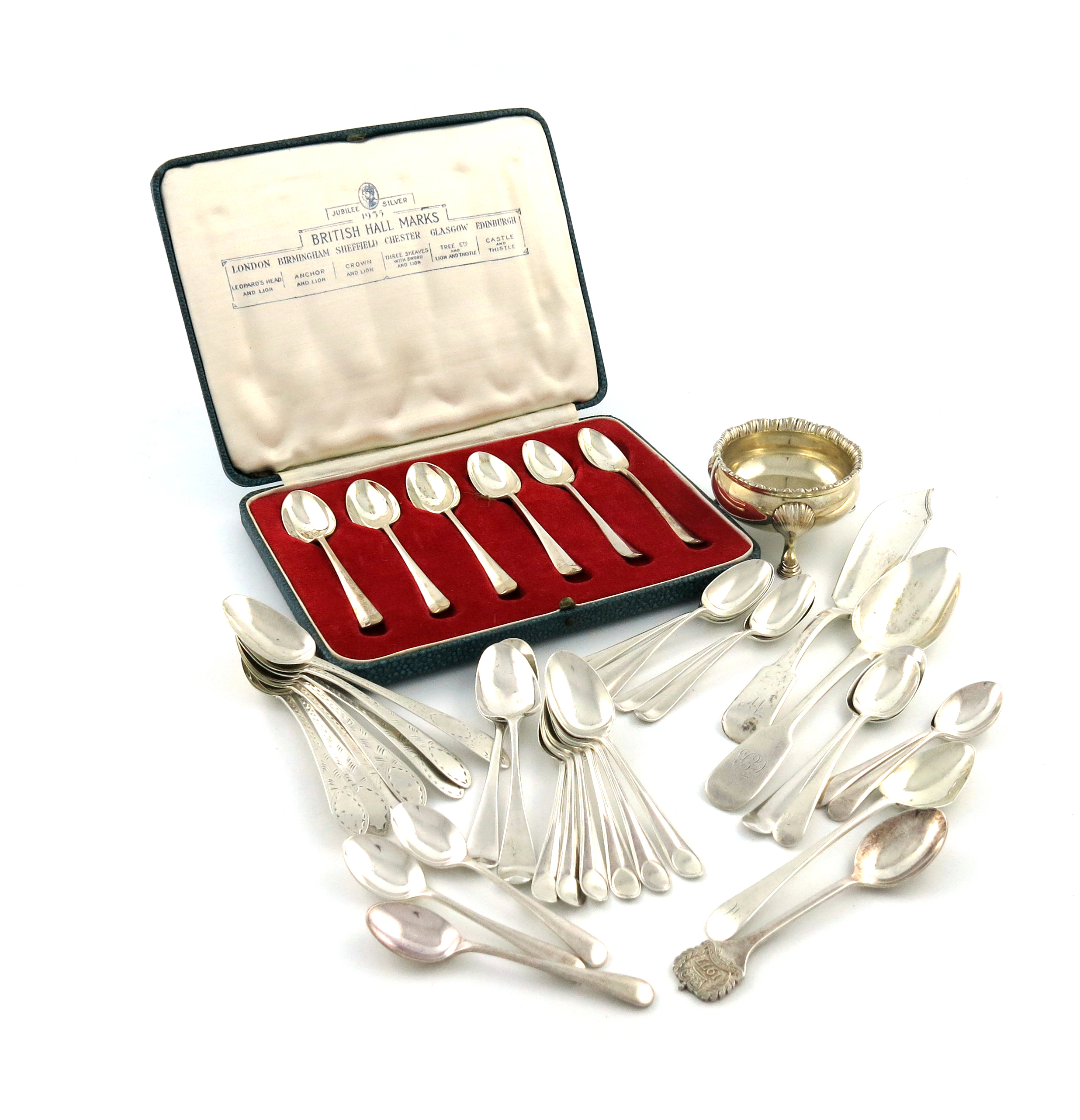 comprising: a single George II salt cellar, London 1749, cauldron form, gadroon border, on three hoof feet, a set of six Scottish Bright-cut Celtic point teaspoons, a dessert spoon, a butter knife, two sets of six teaspoons, (one cased), plus various teaspoons and six electroplated spoons, approx. weighable 15oz. (qty)