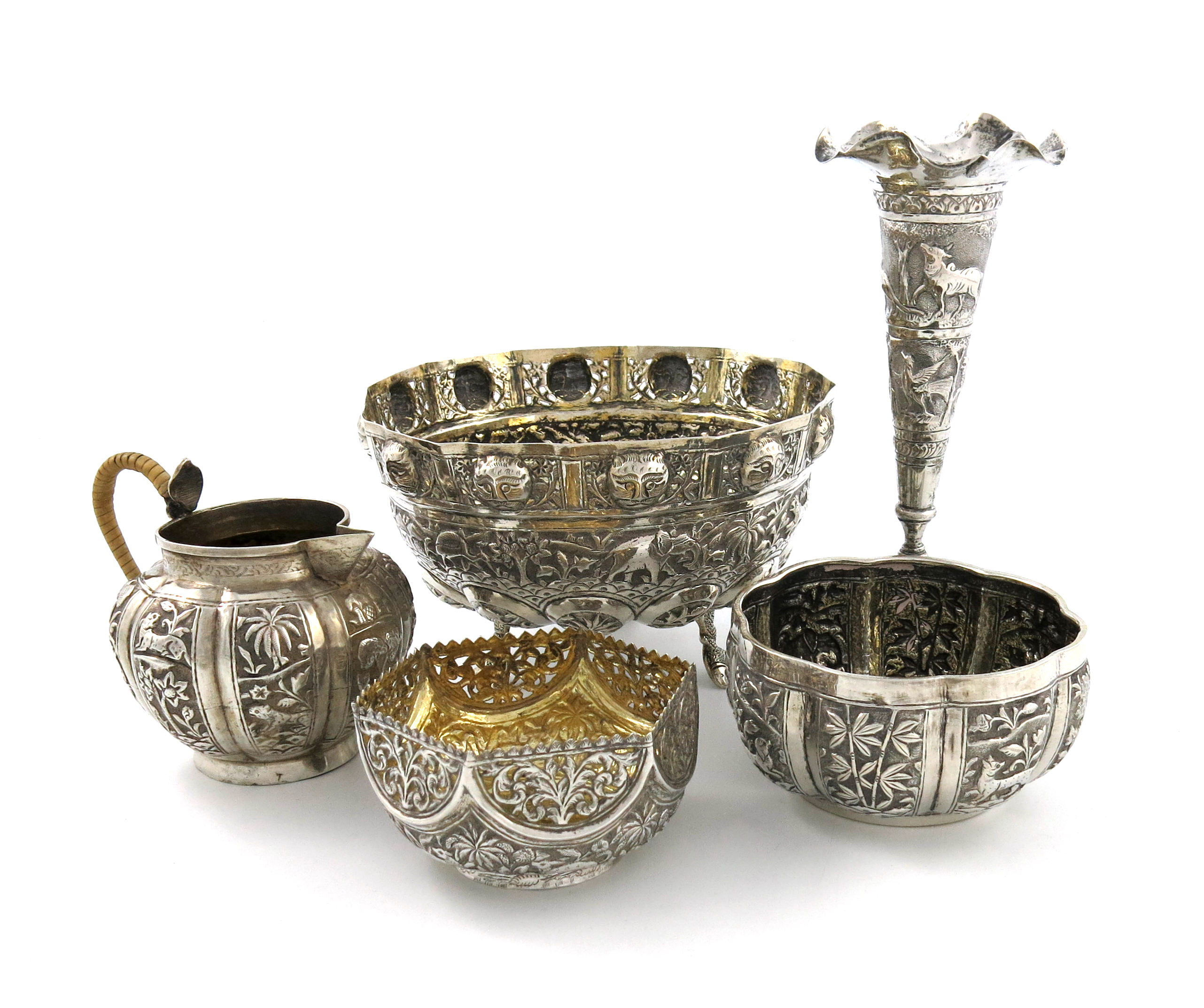comprising: a bowl of panelled circular form, embossed with elephants and animals in foliate settings, with a border of pierced and mask decoration, on four feet, plus a cream jug, two bowls, and a vase, approx. weight 23oz. (5)