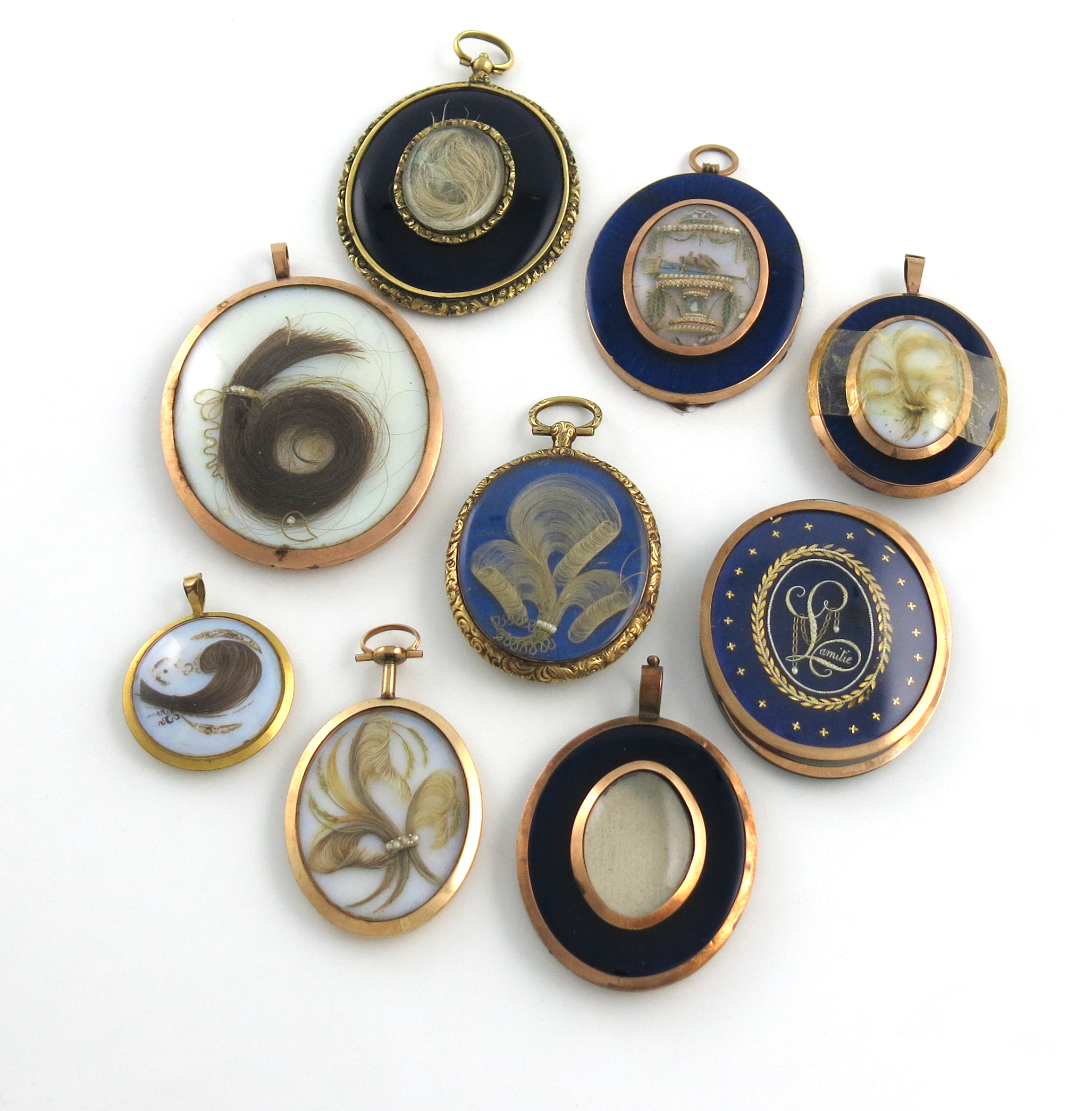 oval form, some with enamel, lockets of hair, and seed pearl decoration, with loop attachments. (9)
