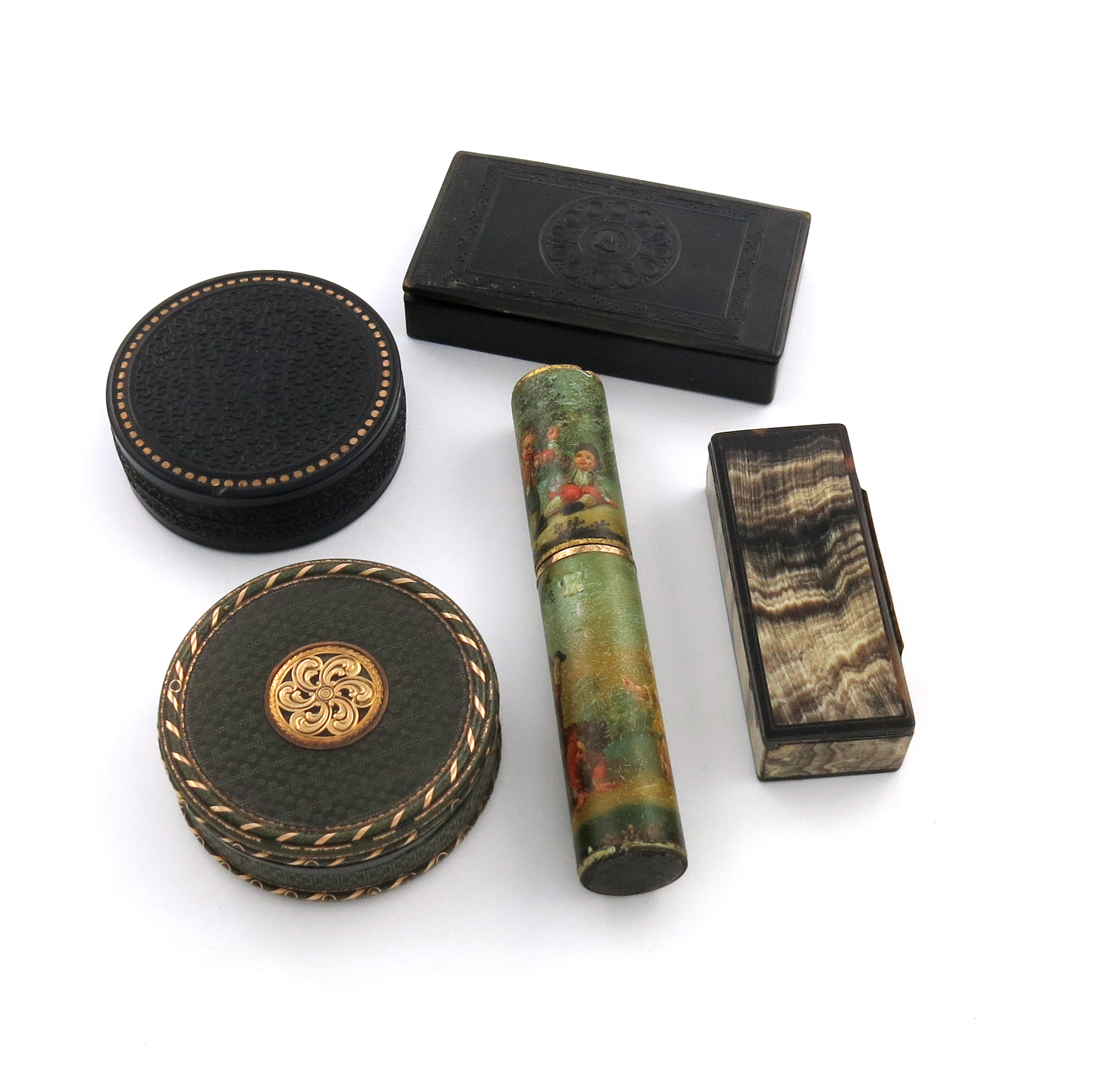 comprising: an early 19th century tortoiseshell box, of circular form, with wriggle-work decoration, and with a stud border, plus a gold-mounted composition box of circular form, tortoiseshell lines, the pull-off cover with a scroll rosette, plus a gilt lined horn box, a composition box of rectangular form, the cover with two portraits, and a bodkin case painted with scenes of children. (5)