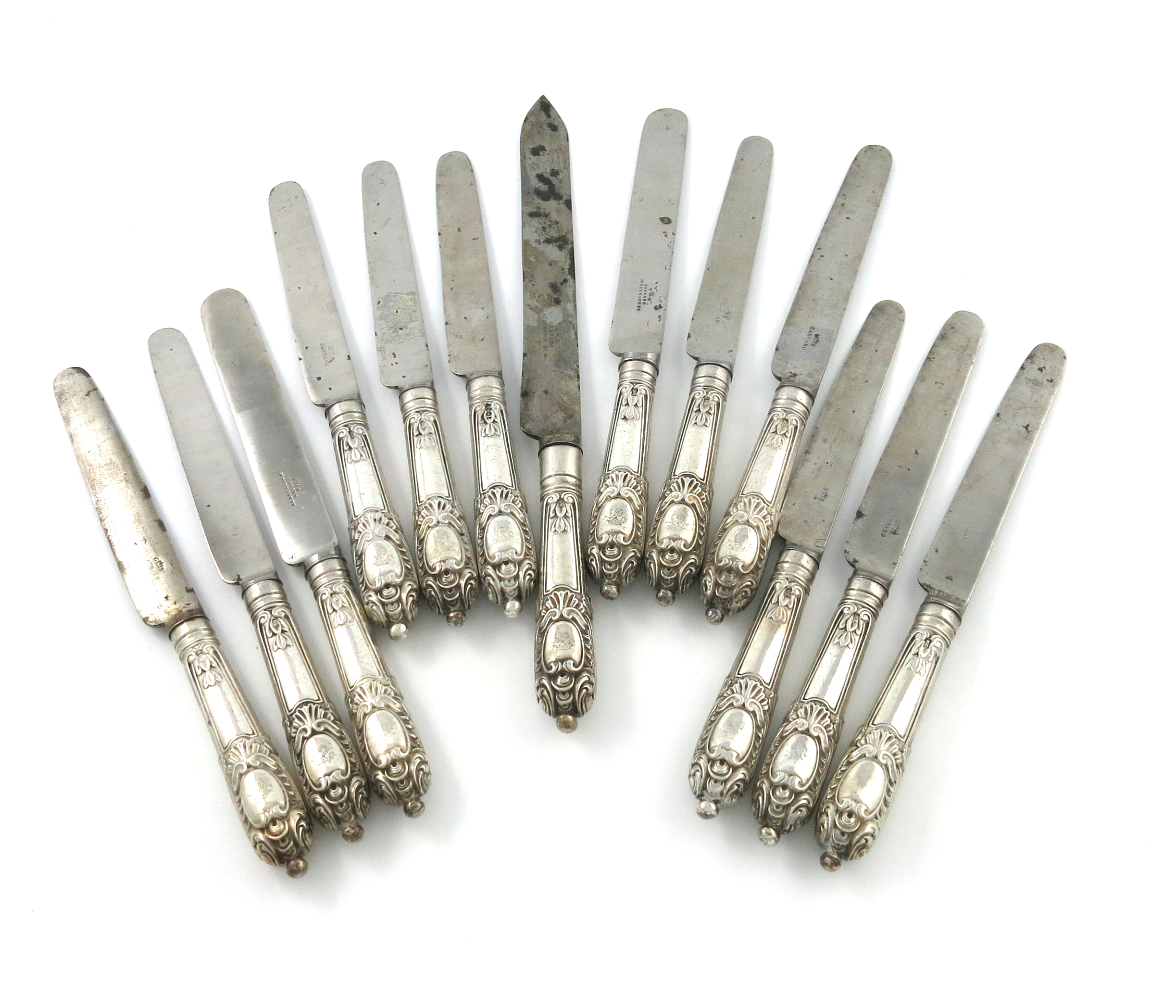 the handles with scroll and shell motifs and engraved with a crest, some re-bladed, plus a carving knife. (13)