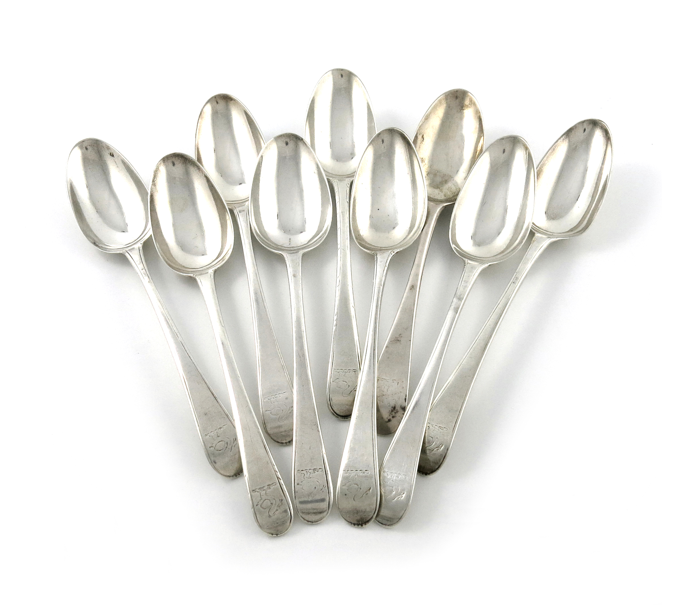 A collection of nine George III silver Feather-edge pattern tablespoons