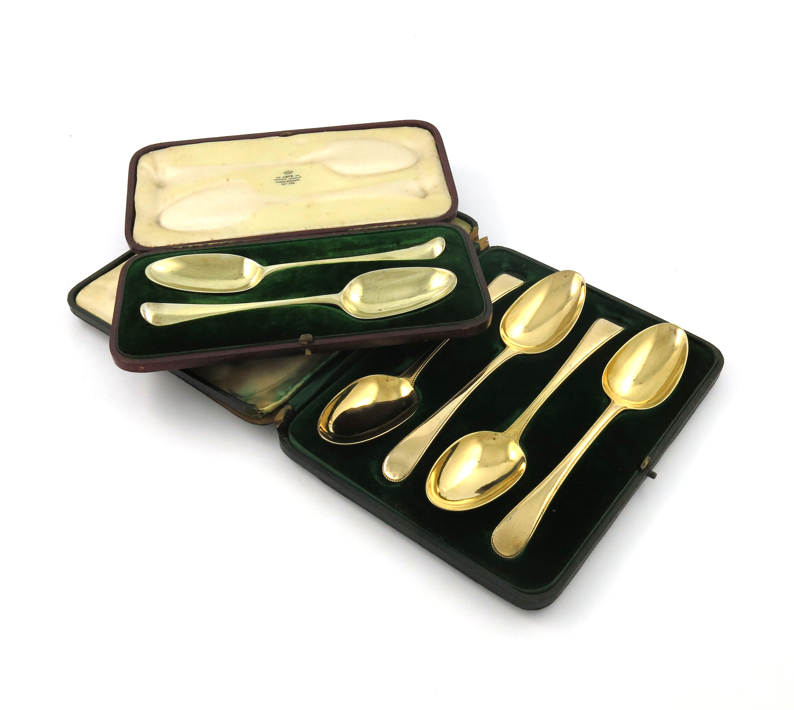 later gilded, in a fitted case, retailed by Garrards, plus a cased pair of George II silver-gilt tablespoons, by Ebenezer Coker, London 1751/52, approx. total weight 12.9oz. (6)