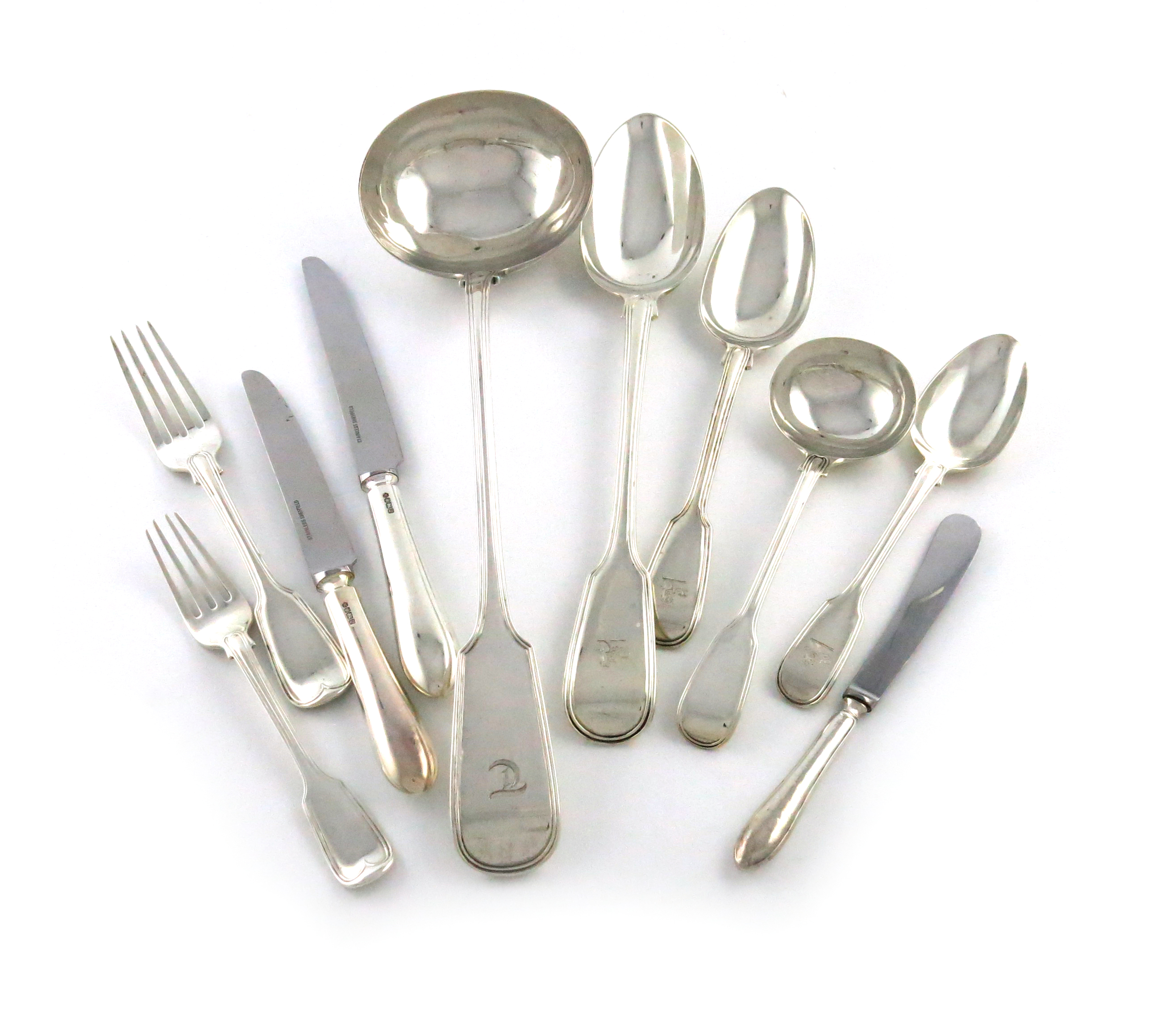 the terminals with crests, comprising: six tablespoons, six table forks, six dessert spoons, six dessert forks, a pair of sauce ladles, a pair of basting spoons, and a soup ladle, (single struck), the terminal initialled, plus a set of eight modern table knives and six dessert knives, and a set of six butter knives, approx. weighable 78.9oz. (qty)