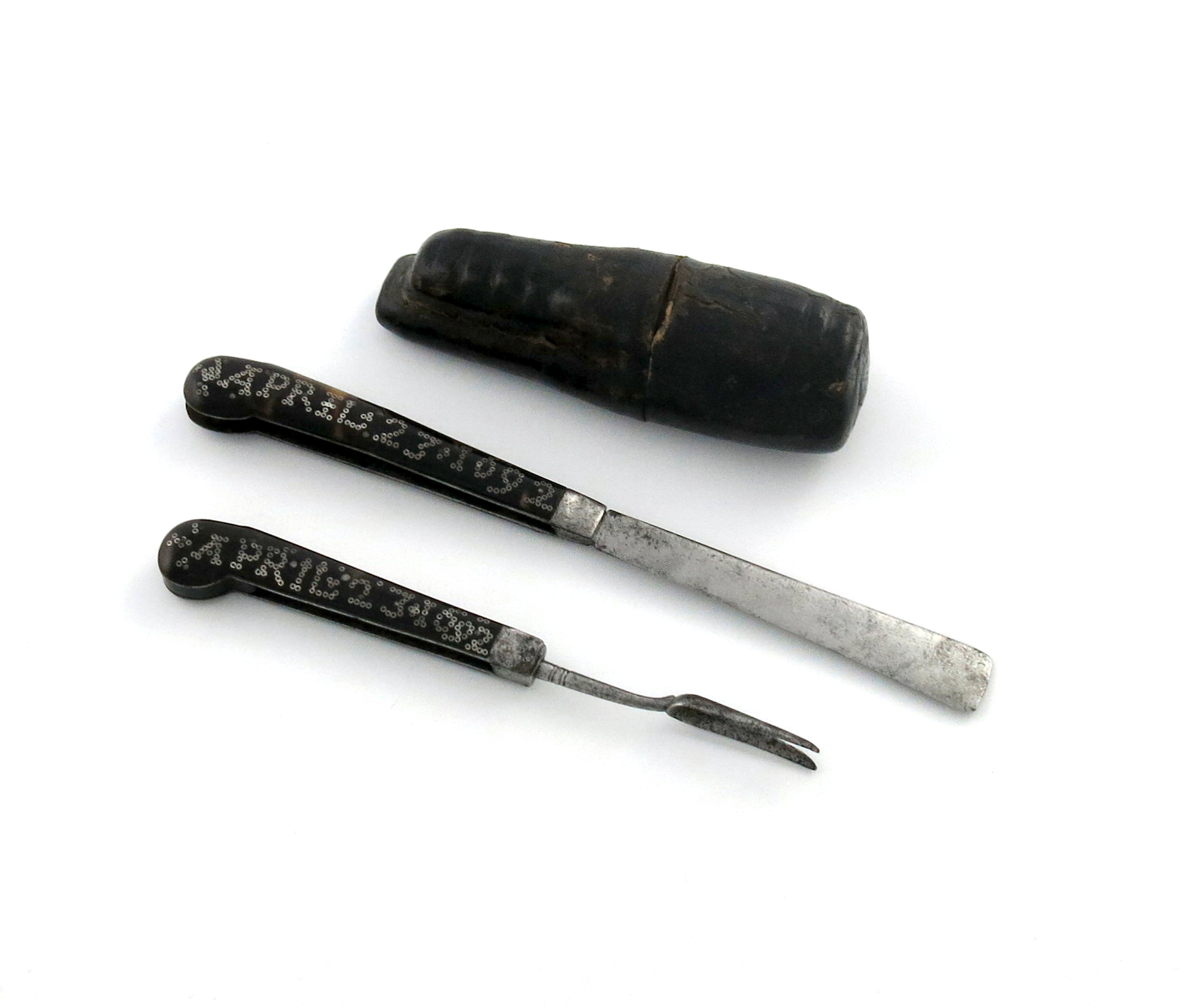the tapering tortoiseshell handles inlaid with stud work 'Rose King, April 23, 1692', the fork with two tines, in a fitted leather case, full length of knife 19.2cm.