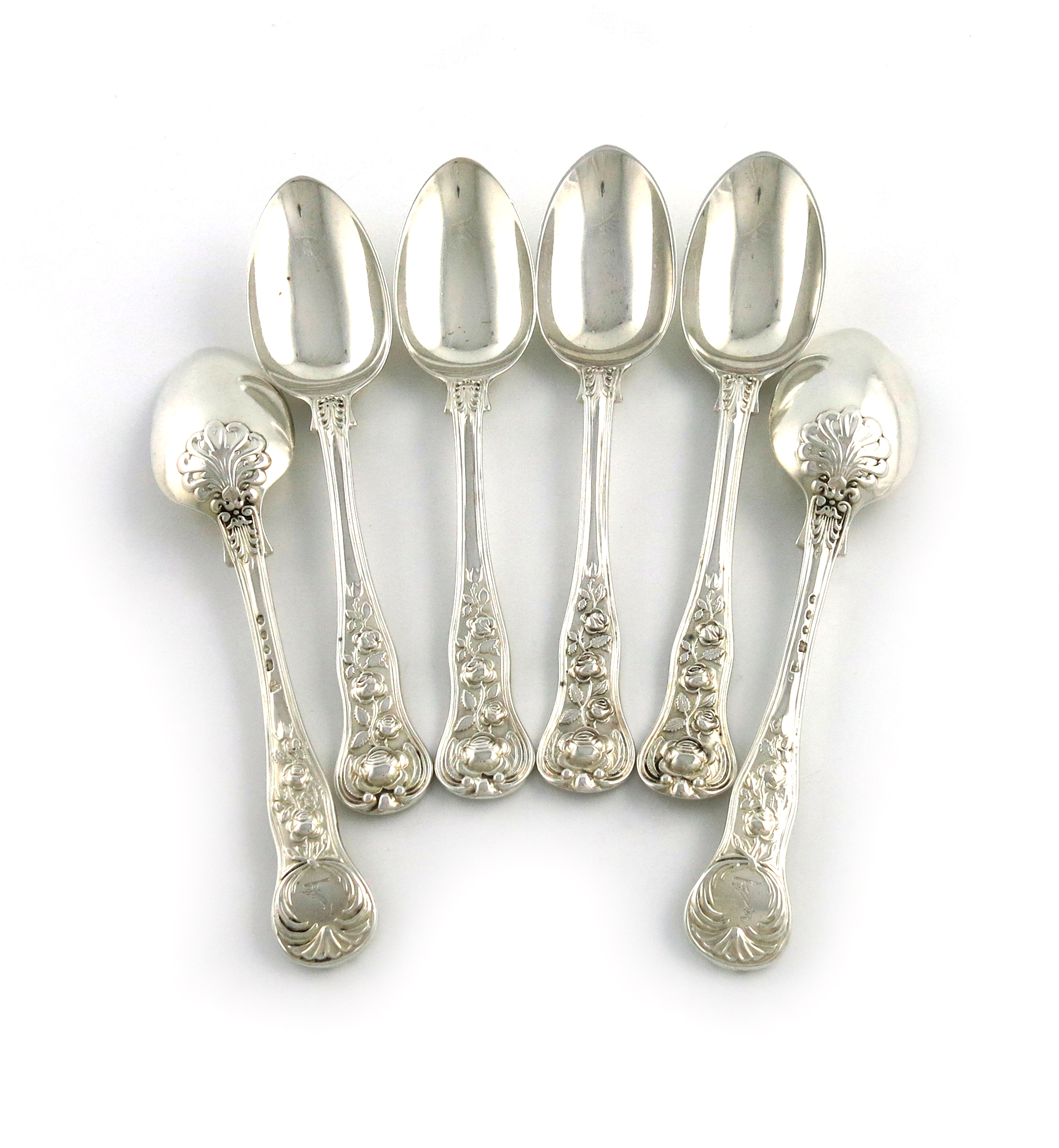 A matched set of six Victorian silver Rose pattern dessert spoons