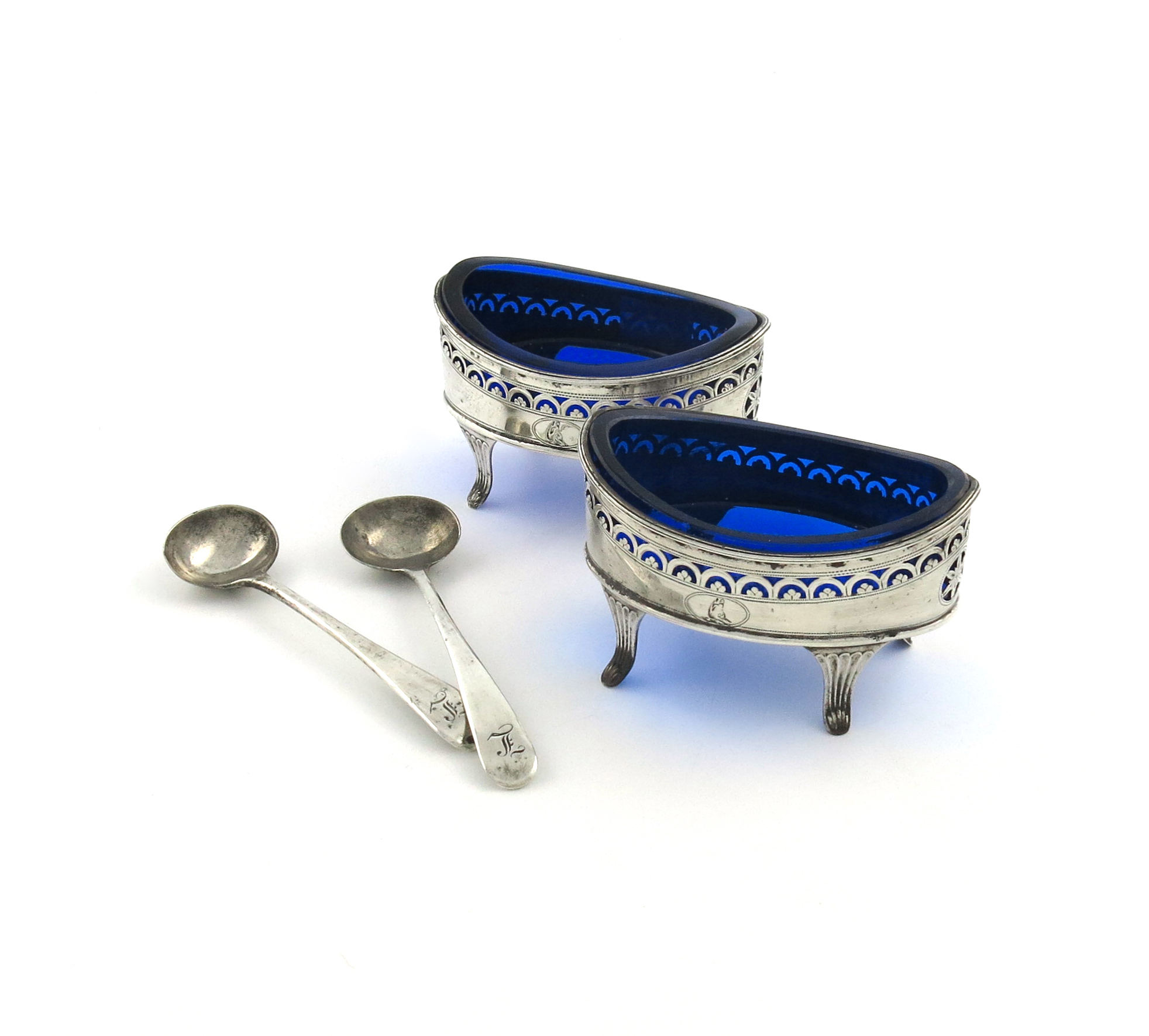 oval form, pierced and engraved decoration, blue-glass liners, on four fluted legs, length 8.7cm, plus two salt spoons, approx. weight 3.8oz. (4)