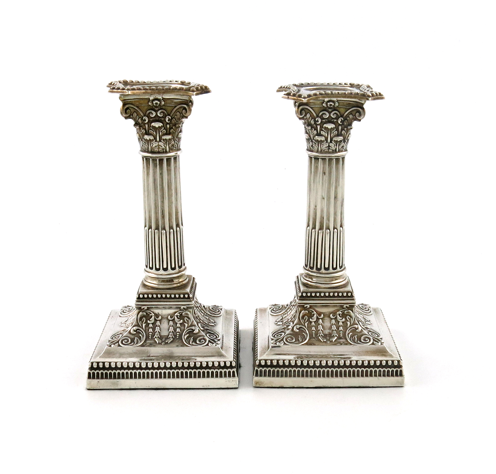 Corinthian column form, detachable drip pans with beaded borders, on raised square bases with foliate and swag decoration and with beaded borders, height 17cm. (2)