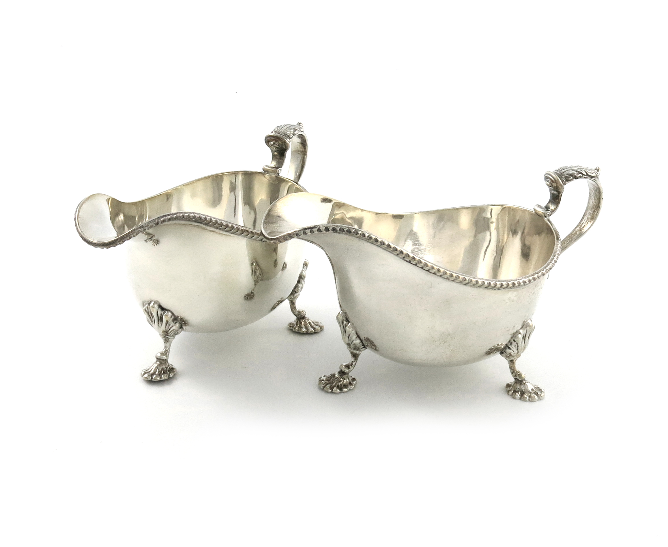 oval form, leaf capped scroll handles, gadroon borders, on three shell pad feet, length 16.8cm, approx. weight 12.5oz. (2)