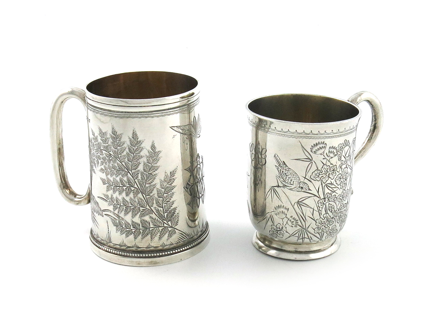 tapering circular form, engraved with a butterfly and fern decoration, initialled, plus another Victorian silver Aesthetic mug, by William Edwards, London 1881, engraved with birds, bamboo and foliate decoration, approx. total weight 9.7oz. (2)