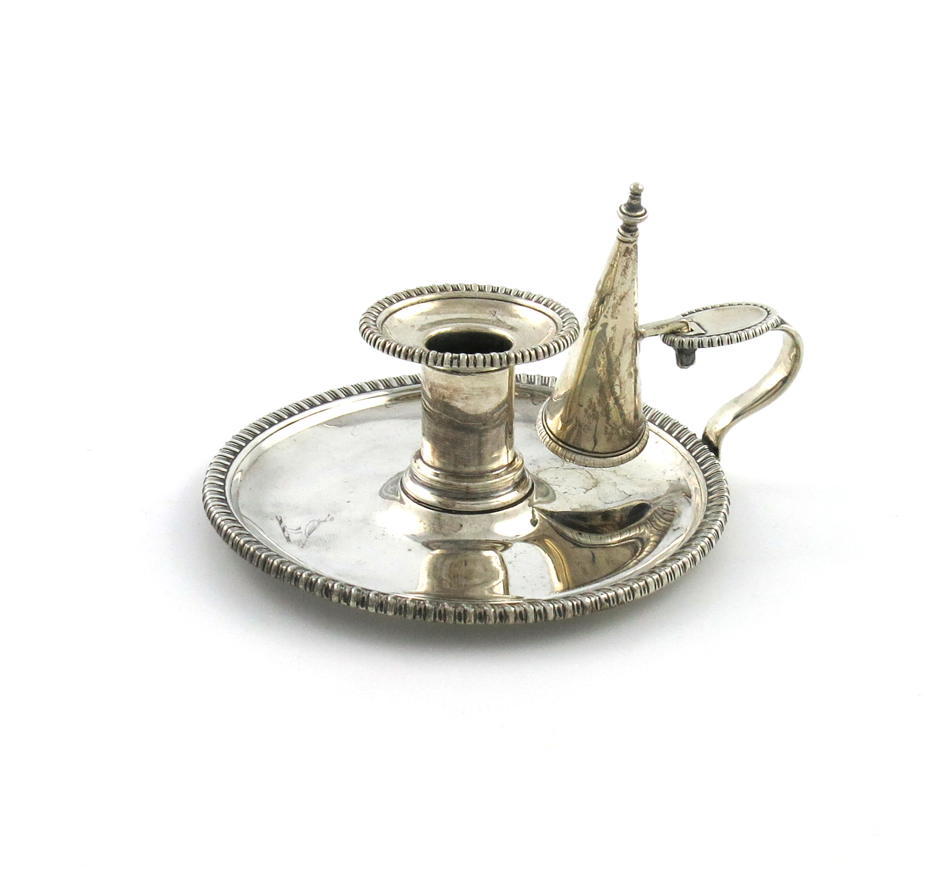 circular form, gadroon borders, the handle with an oval thumb-piece, engraved with a crest, with a later conical snuffer, diameter 14.5cm, approx. weight 9oz.