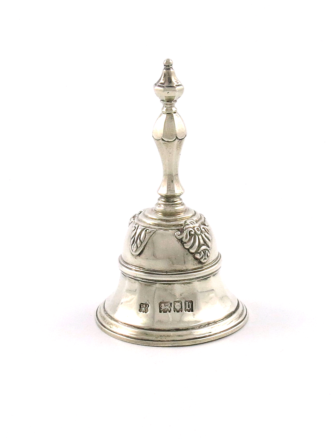 conventional form, applied with foliate motifs, faceted baluster handle, the clanger marked, height 11.4cm, approx. weight 7.5oz.