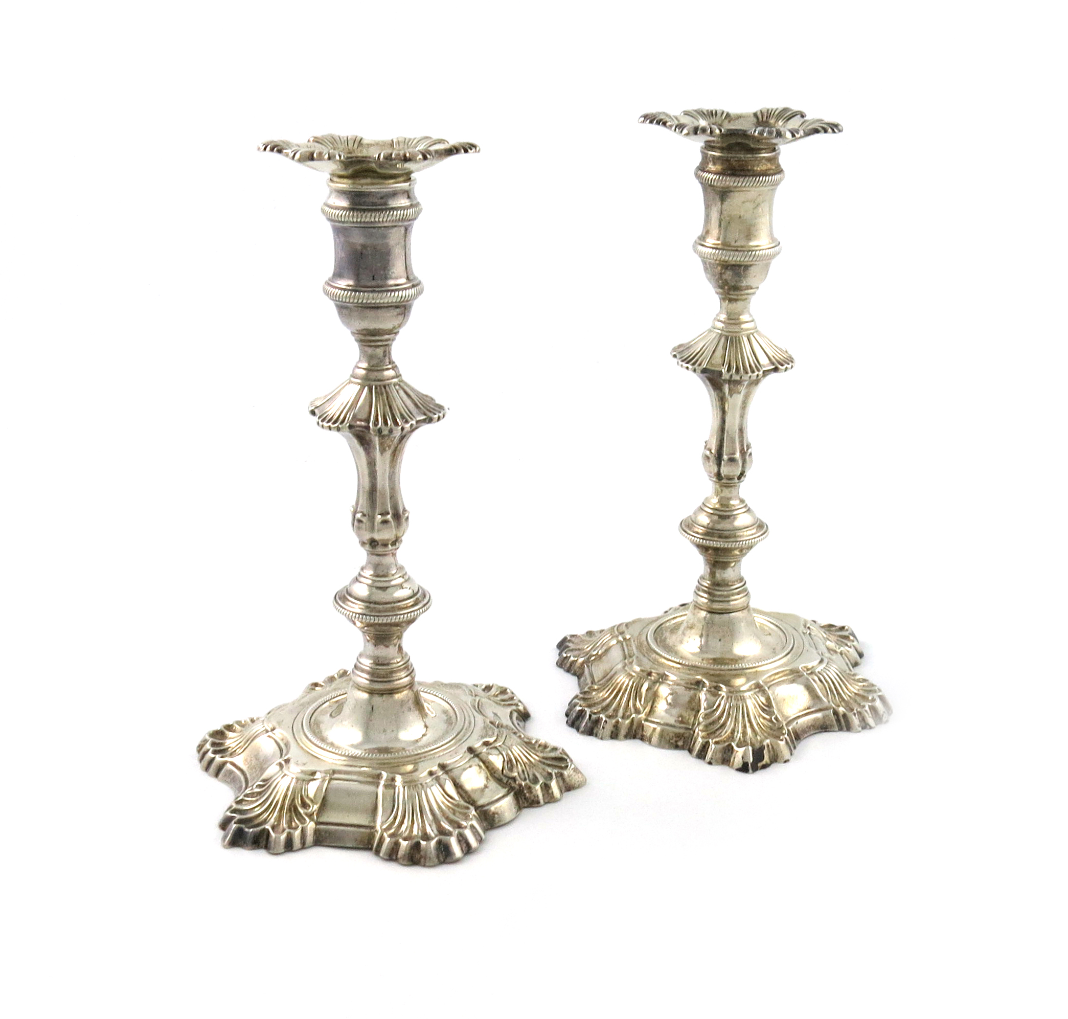 knopped baluster stems, with shell shoulders, spool shaped capitals, rope-work borders, detachable drip pans, on hexafoil bases with shell motifs, height 21.5cm, approx. weight 40.5oz. (2)
