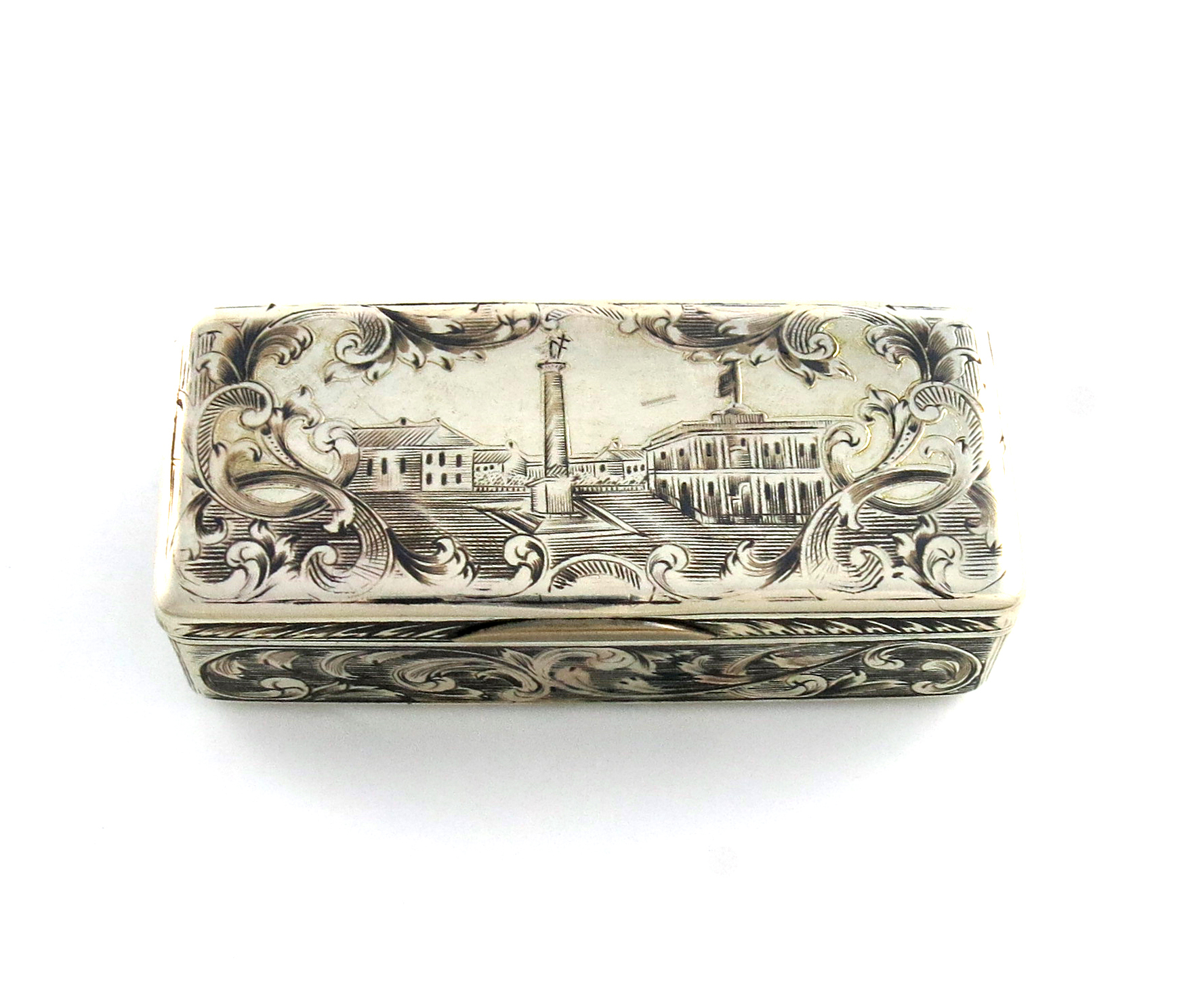 rectangular form, the hinged cover and base with city scenes within foliate scroll decoration, plain thumb-piece, length 8.7cm, approx. weight 3.3oz.