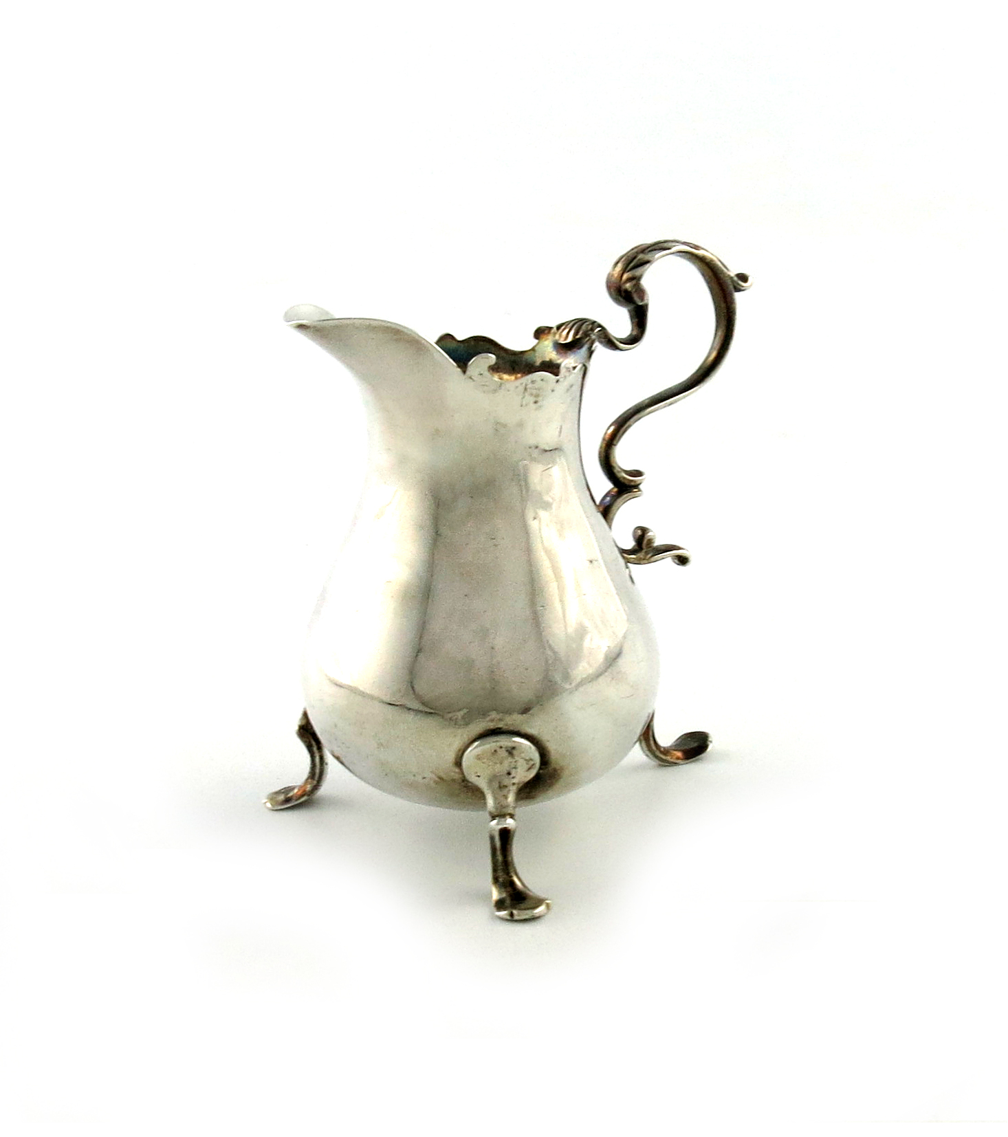 baluster form, leaf capped scroll handle, wavy-edge border, on three hoof feet, the underside inscribed 'Honour Husey 1744', height 9cm, approx. weight 2.8oz.