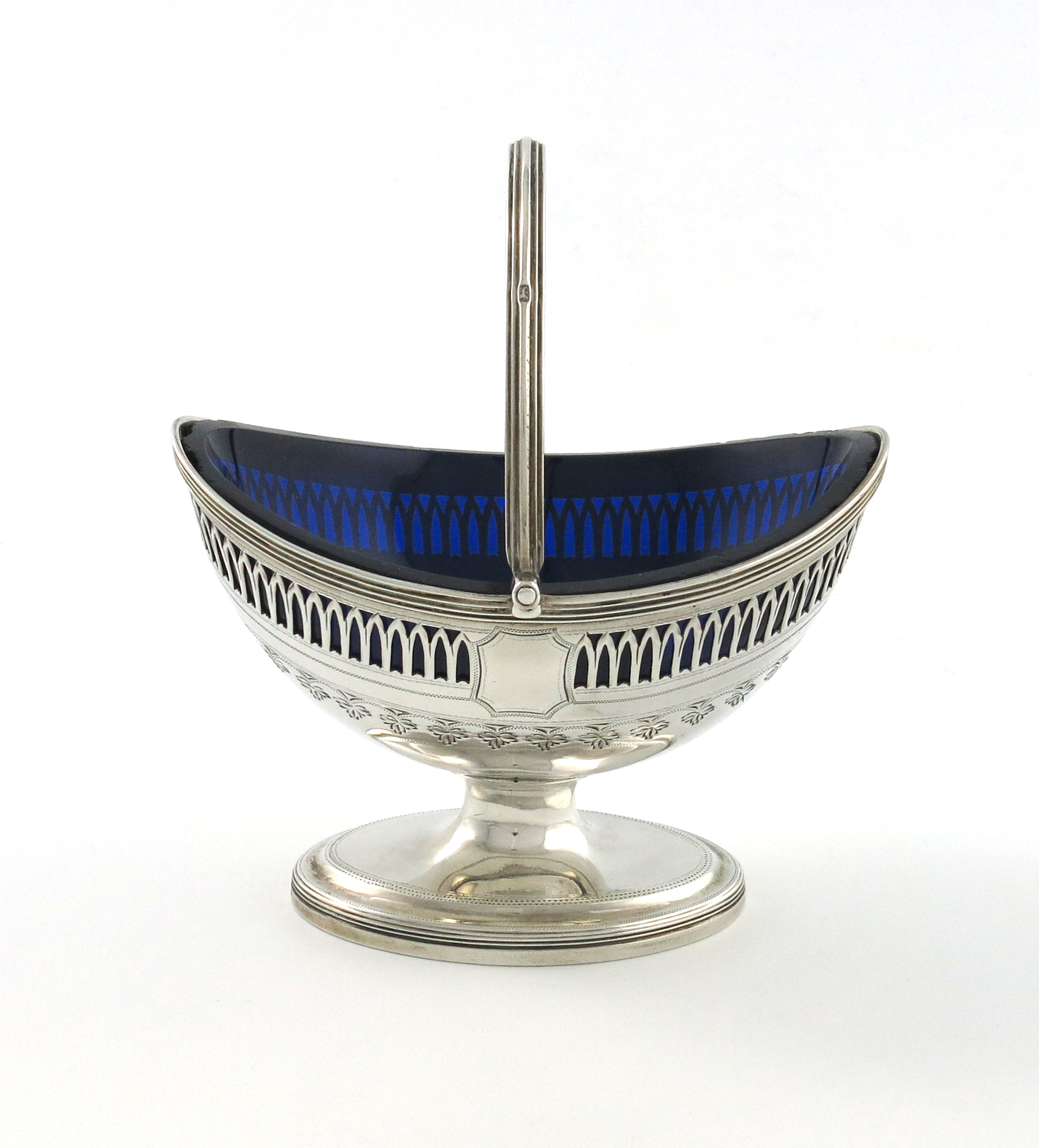 oval form, pierced decoration, reeded swing-handle and border, bright-cut decoration, on a raised oval foot, length 12cm, approx. weight 4.5oz.