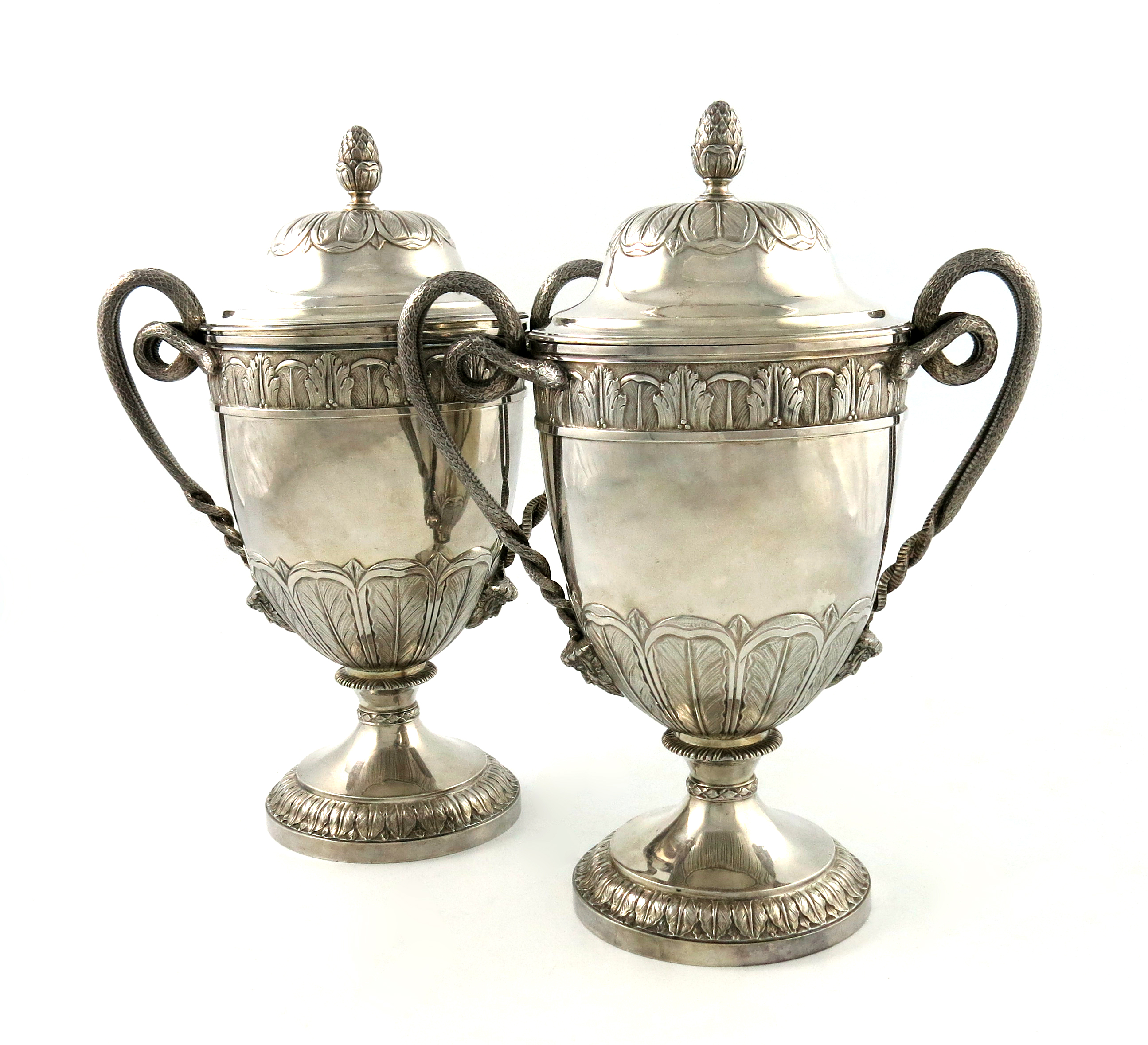 vase form, intertwined double snake scroll handles, terminating in Bacchus masks, chased acanthus borders, the pull-off covers with cone finials, on raised circular bases with acanthus borders, height 31.5cm, approx. weight 105oz. (2)