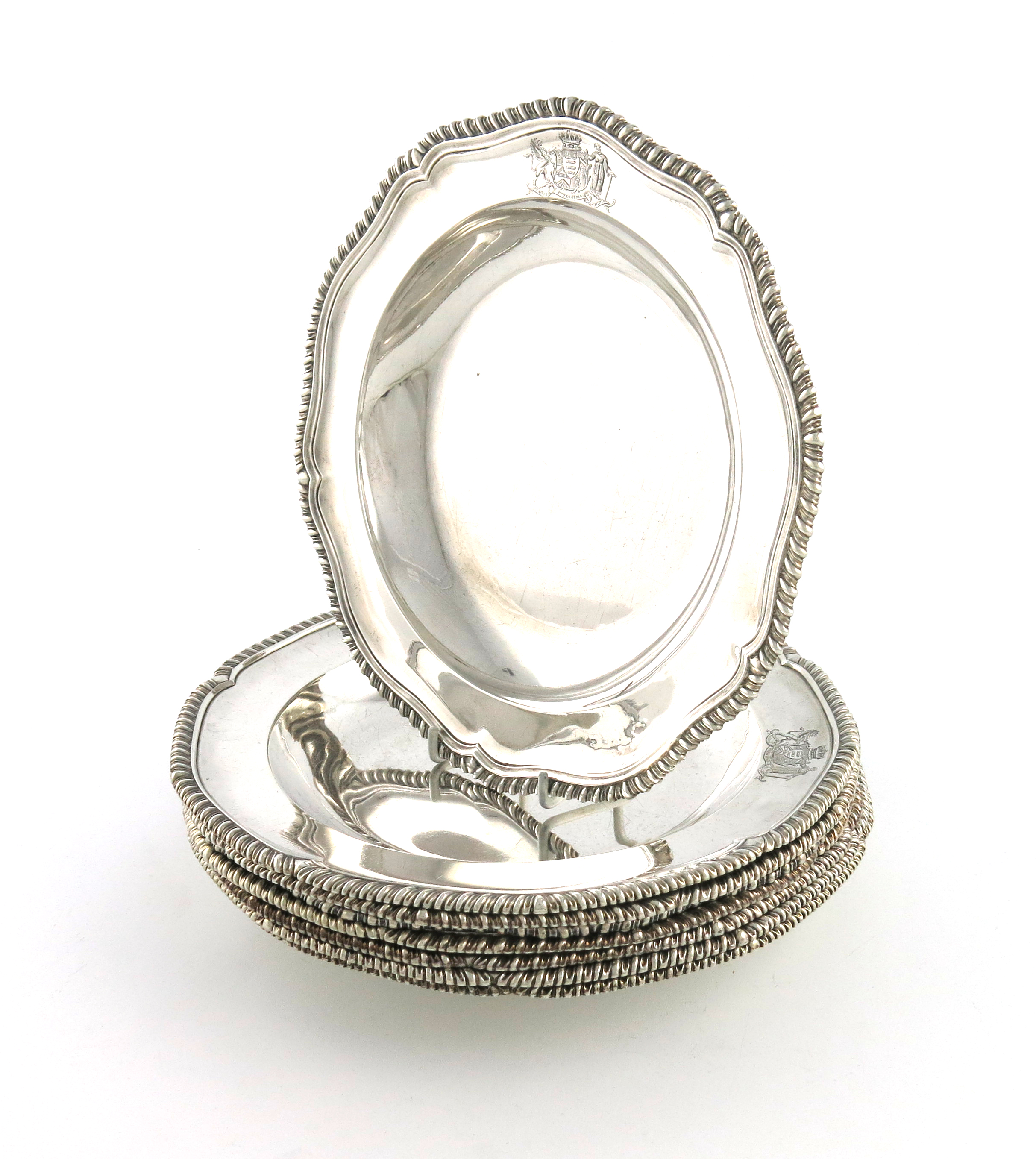 shaped circular form, gadroon borders, engraved with an armorial, the undersides with scratch weights, diameters 24.5cm and 24.3cm, approx. weight 149oz. (8)