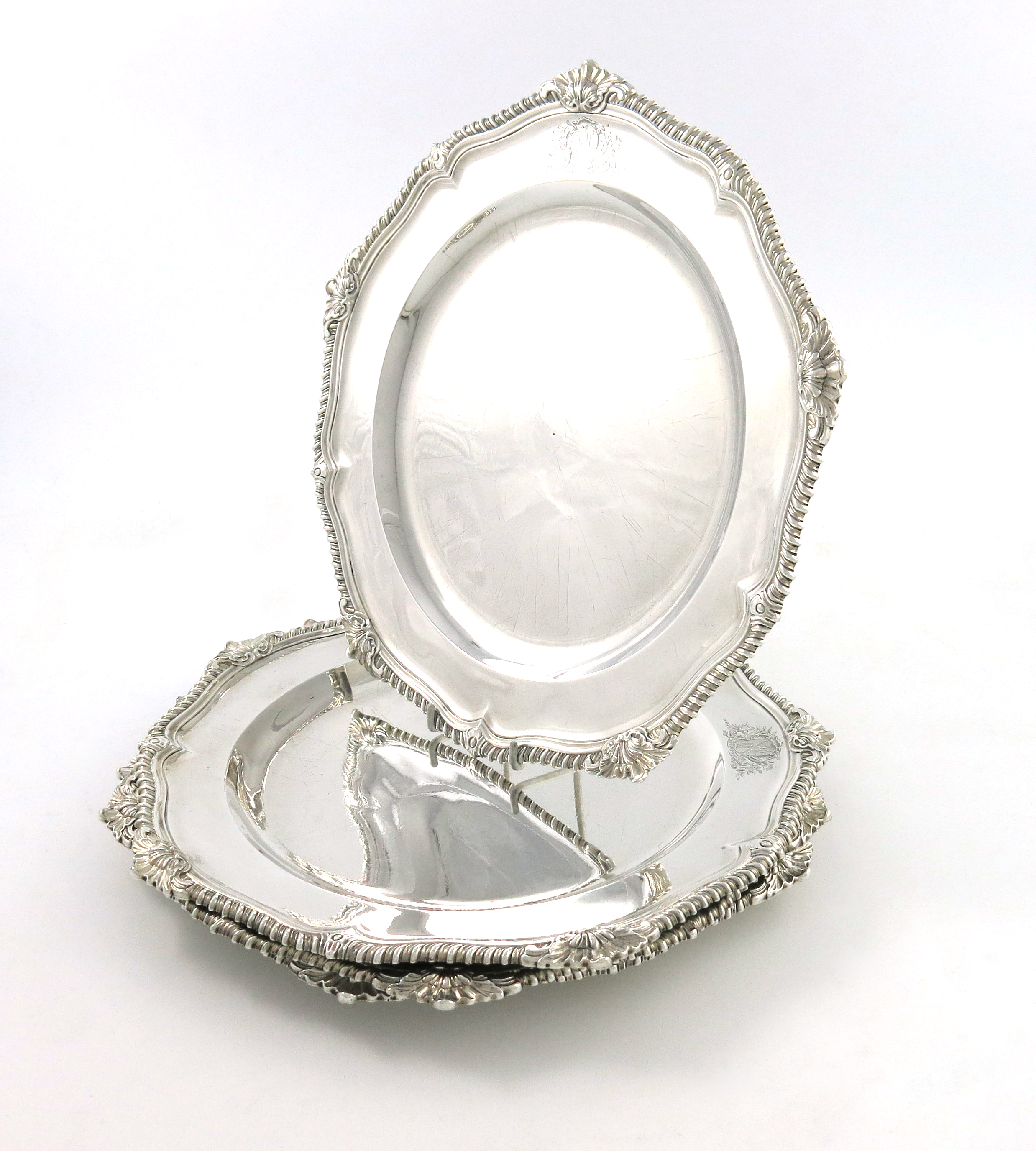 by Perter Archambo and Peter Meure, London 1753,shaped circular form, gadroon and shell borders, engraved with an armorial, the undersides with a scratch number and weight 'N0.3, 34=13', 'No.6 36=2', No.7 34=19', and 'No.8 36=2', diameter 32cm, approx. weight 139.5oz. (4)