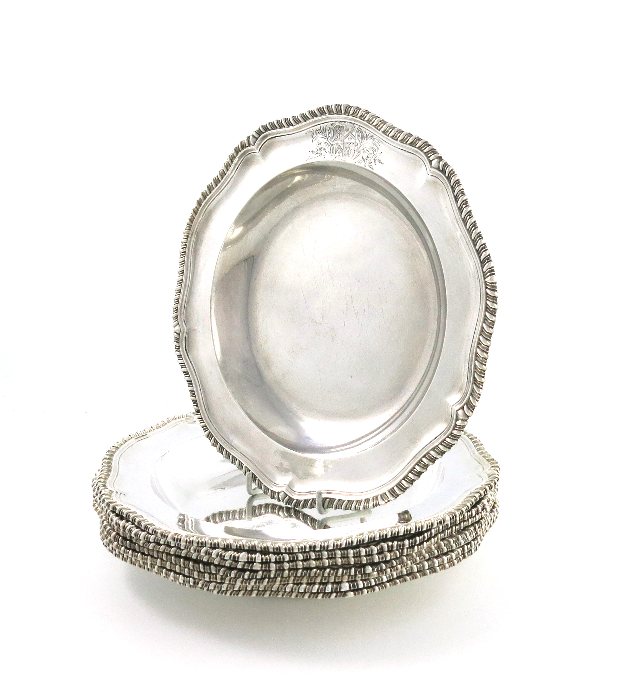 shaped circular form, gadroon borders, engraved with an armorial within foliate mantling, the undersides with scratch weights and numbered '3, 5, 10, 61, 62, 63, 66, 71', diameter 14.3cm, approx. weight 136oz. (8)