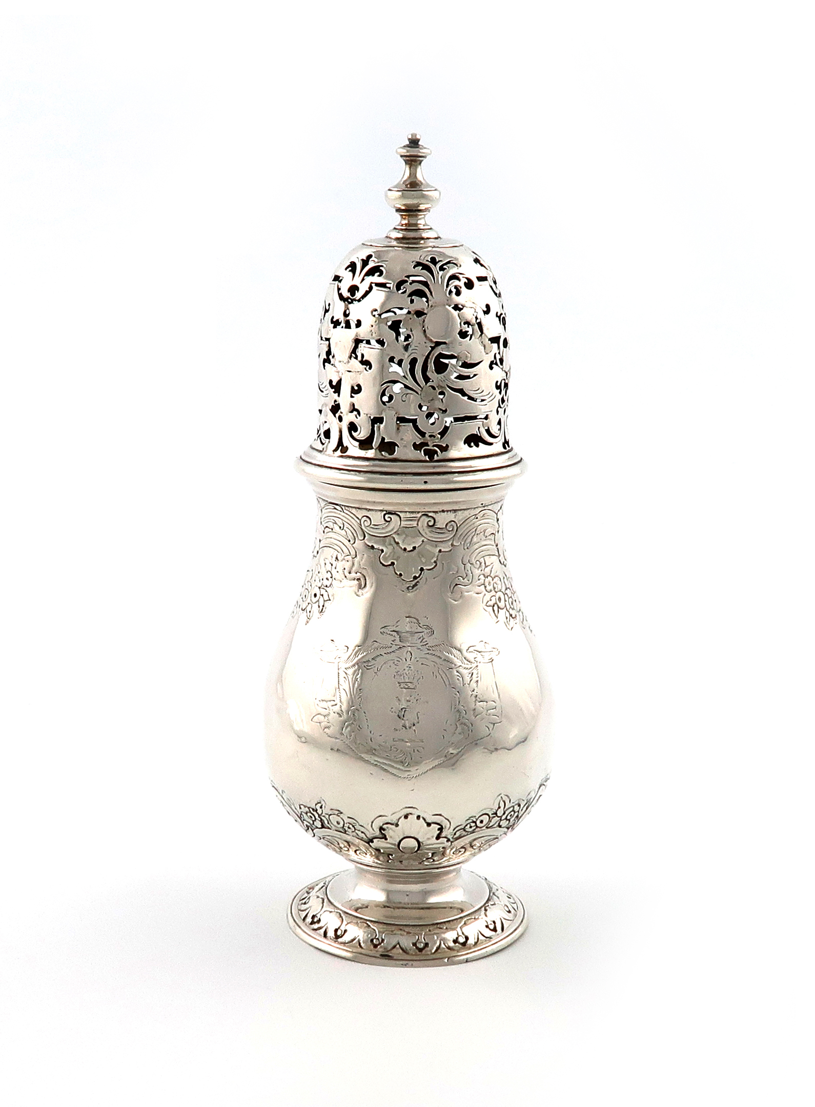 baluster form, chased foliate scroll decoration, engraved with a crest within drape mantling, the pull-off cover apparently unmarked, and with pierced foliate scroll decoration, heavily repaired, and with a baluster finial, on a raised circular foot, height 21.5cm, approx. weight 11oz.