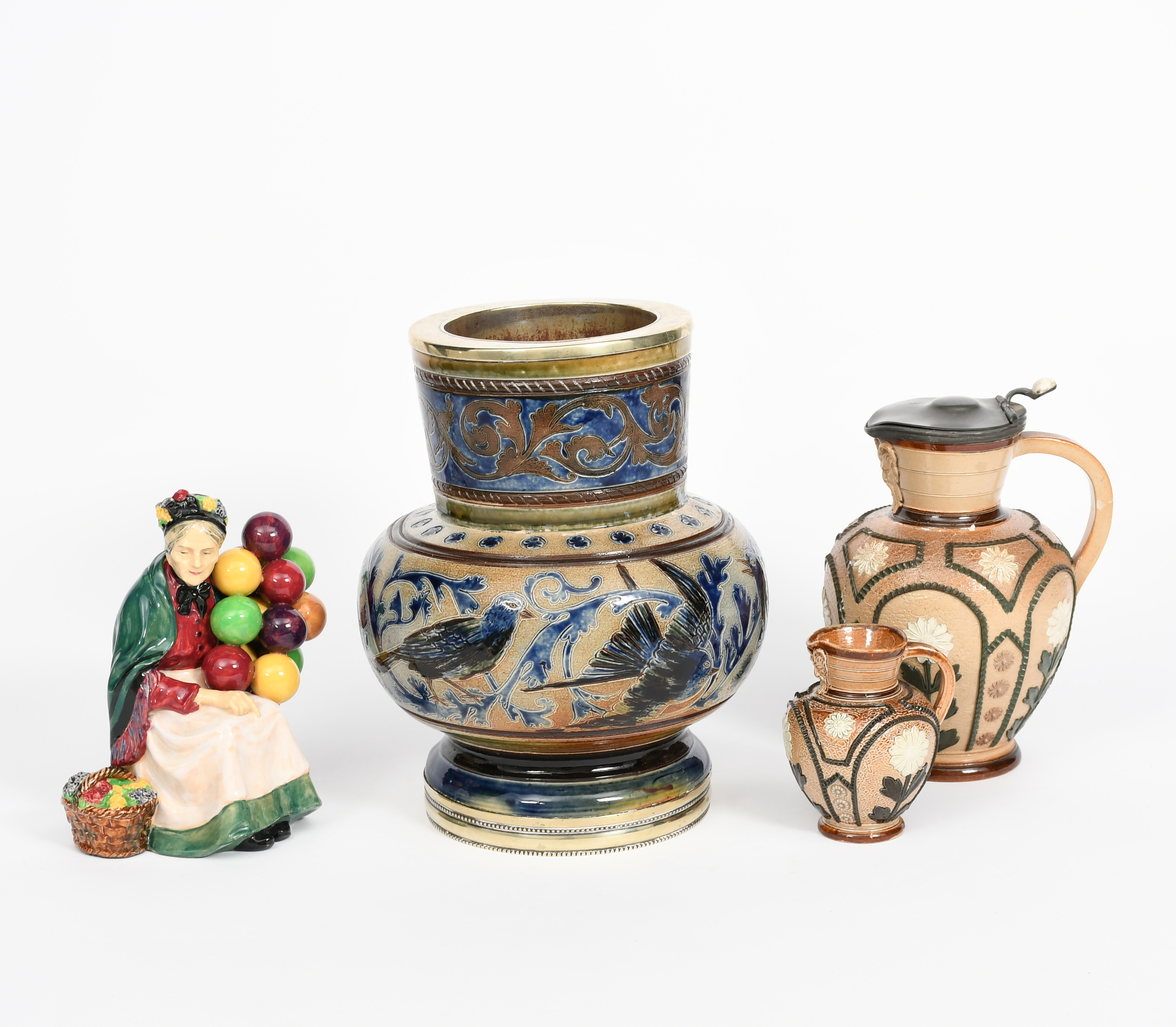 A salt-glaze stoneware vase probably Fulham Pottery, swollen form with cylindrical neck, incised with a band of birds amongst scrolling foliage, the neck with a band of scrolling foliage, in blue and brown on a buff ground, with metal rim and base, two graduated Doulton Lambeth salt-glazed jugs and a Royal Doulton 'Old Balloon Seller' figure, H.N.1315, marks concealed, neck re-stuck, 26.5cm. high, (4)