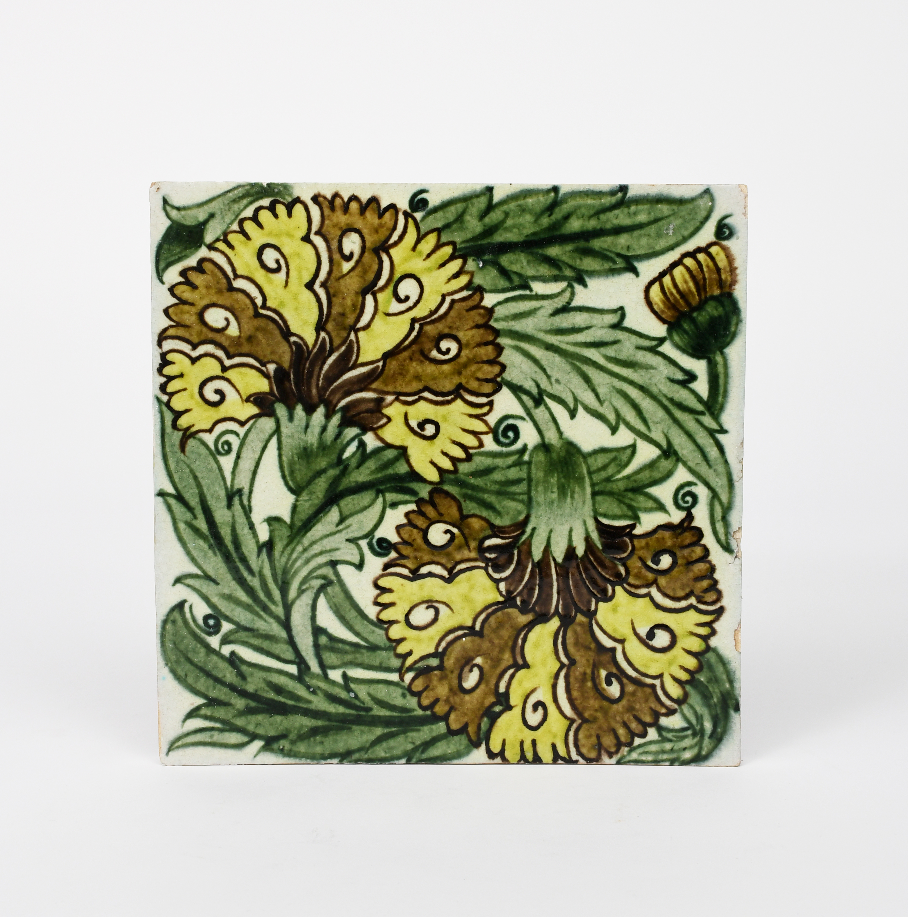 A William De Morgan Early Fulham Period Double Carnation large tile, painted in shades of yellow, ochre and green on a white ground impressed factory mark, minor glaze loss to edge, 20.5cm square
