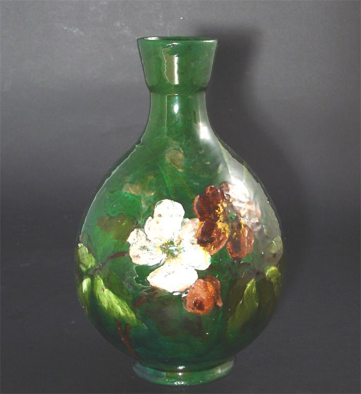 A Haviland & Cie barbotine stoneware vase designed by Ernest Chaplet, painted with blossom spray on a green ground impressed factory marks, restored neck rim 27cm. high Similar design's by Chaplet were exhibited at the Philadelphia Centennial Exposition of 1876