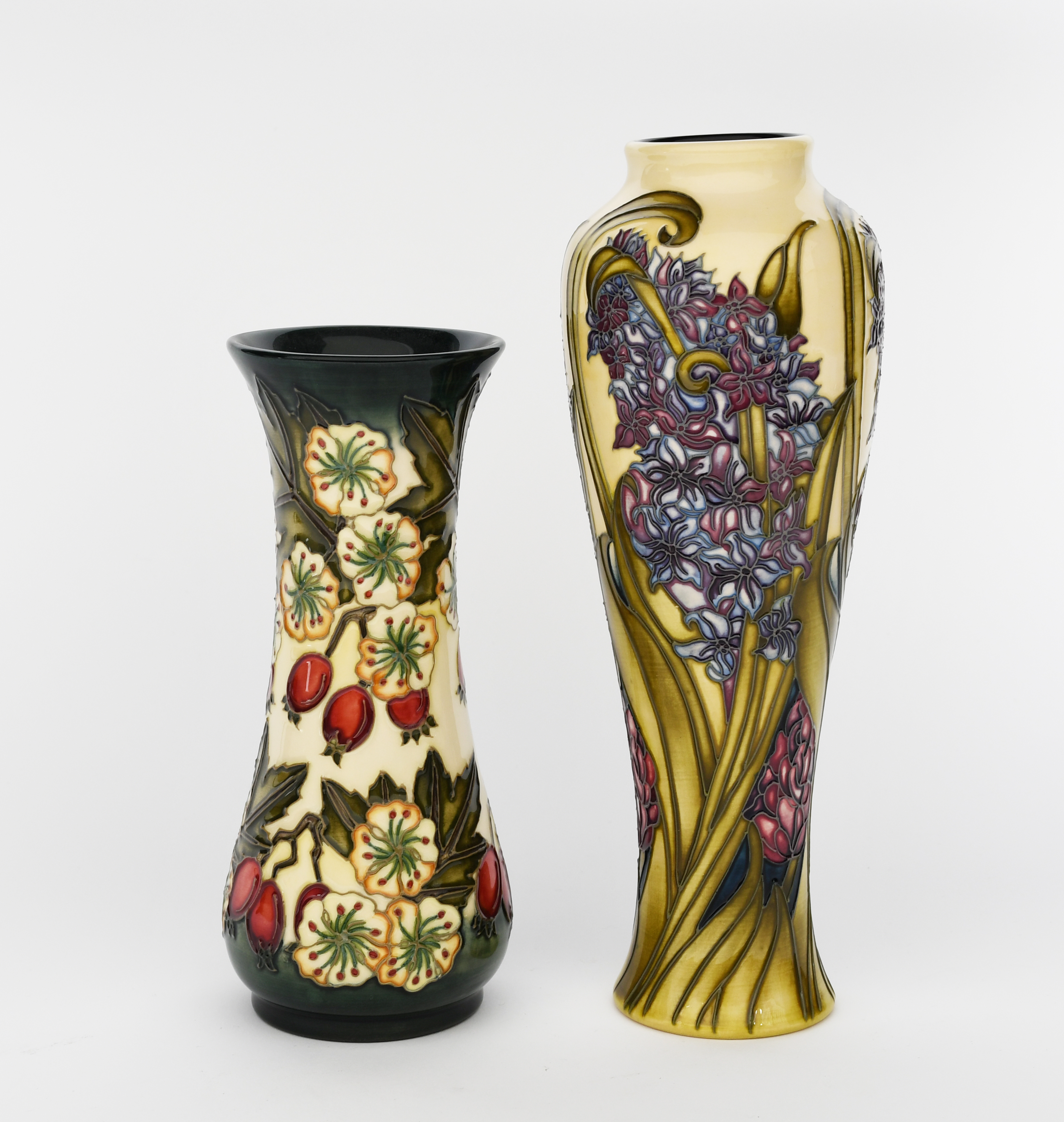 'Lilac' a Moorcroft Pottery vase, slender baluster form painted in colours on a pale yellow ground, and another vase painted with dog rose and rosehips, painted marks, 26.5cm. high (2)