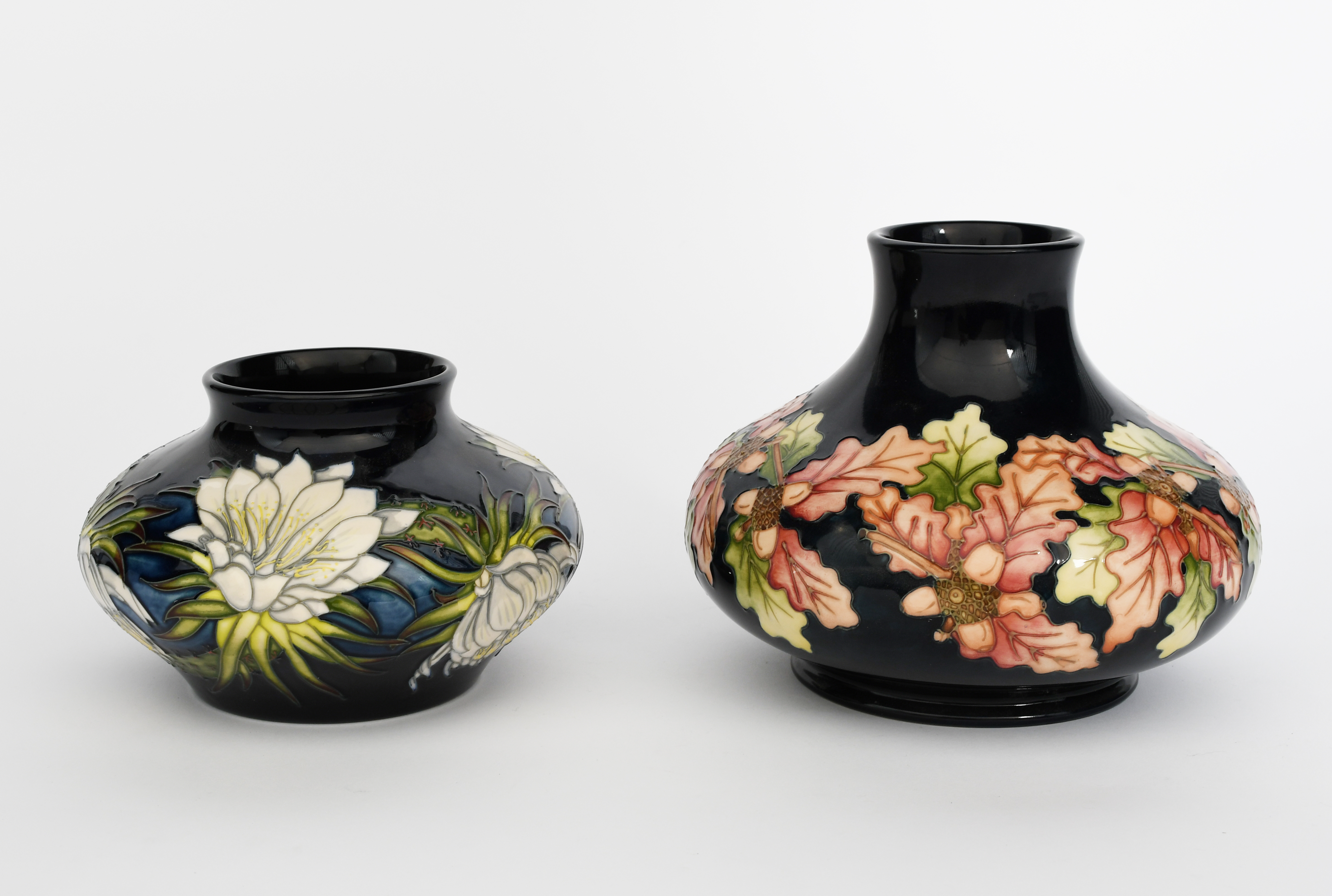 'Acorn Oak Leaf' a Moorcroft Collector's Club vase, dated 1996, painted with acorns and oak leaves in colours on a blue ground, and a smaller 'Queen of the Night' Moorcroft vase by Anji Davenport, painted marks, 16.5cm. high (2)