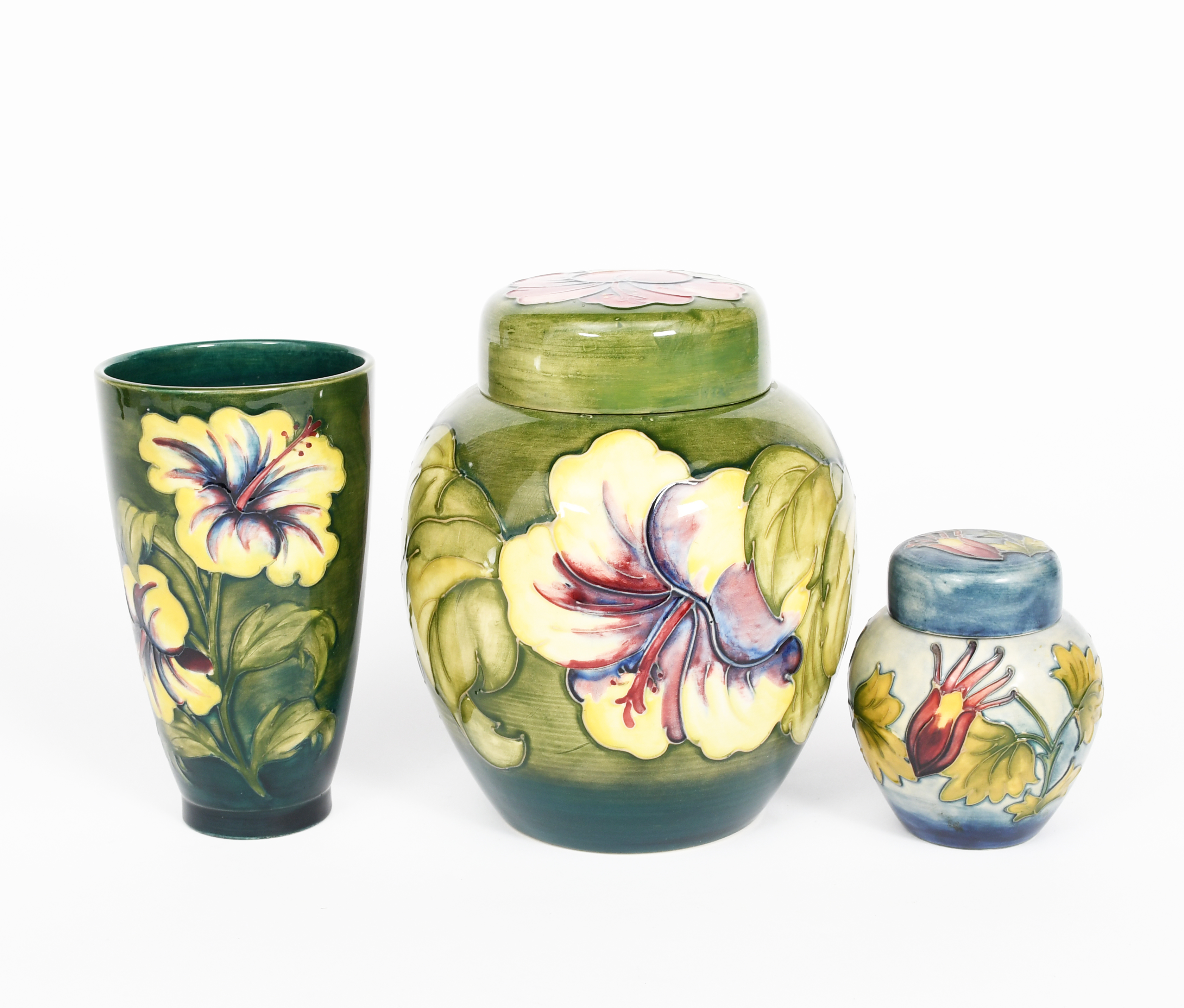 'Hibiscus' a large Moorcroft ginger jar and cover, painted in colours on a green ground, a vase in the same pattern, a springflowers box and cover, a small Aquilegia ginger jar and cover and three dishes,