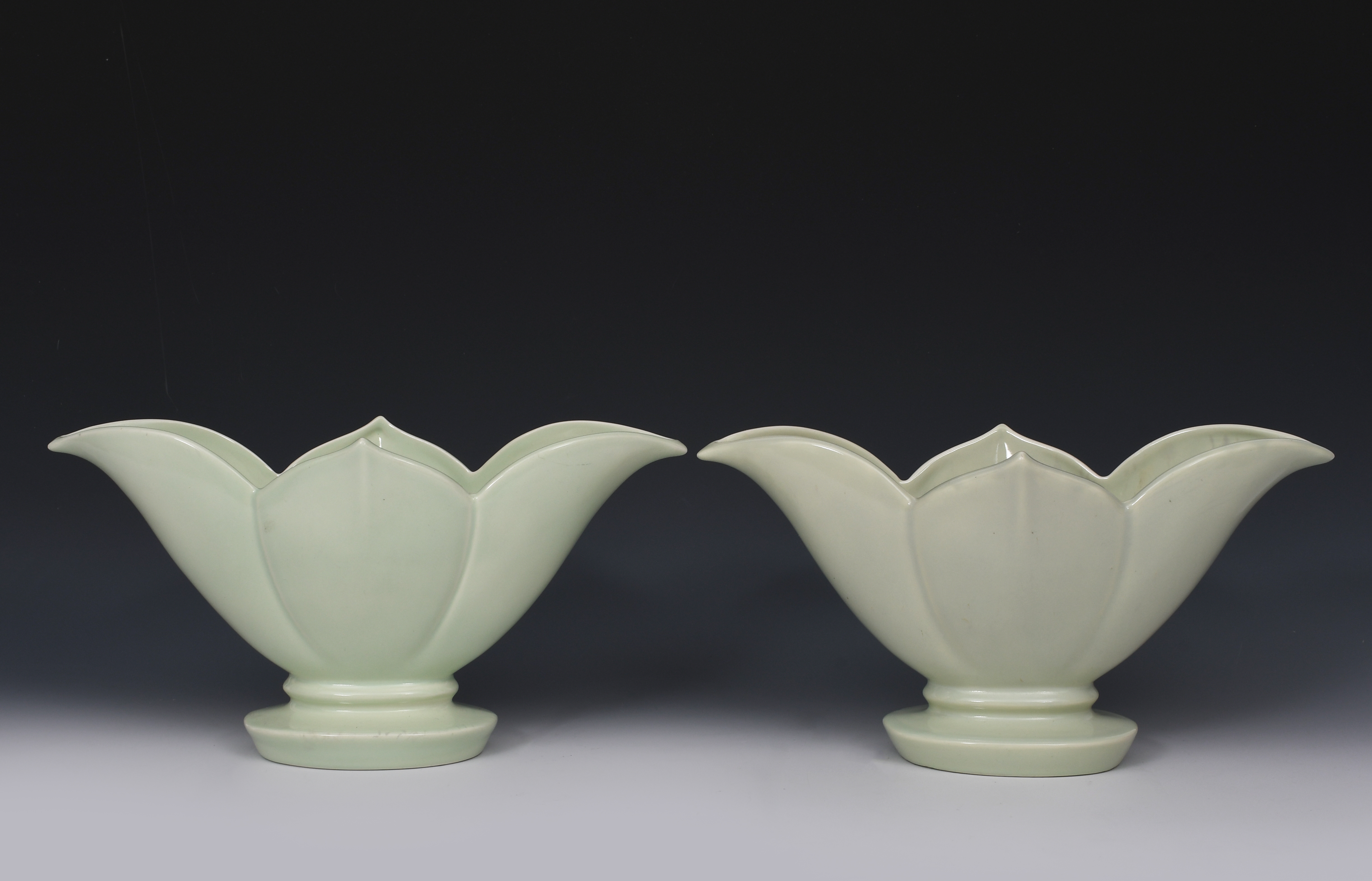 A pair of The Fulham Pottery Lotus vases designed by Charles West, covered in a mint green glaze, printed factory marks, 36cm. wide, (2)